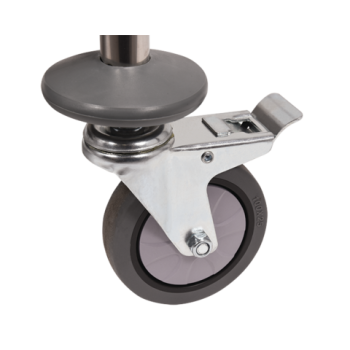 Wózek wyposażono w 4 łożyskowane kółka, wykonane z wysokiej jakości szarego tworzywa TPR. Połączenie twardości z elastycznością materiału gwarantuje wyjątkowo cichą i płynną pracę. Kółka nie tylko nie rysują posadzki i nie pozostawiają na niej śladów, ale także są skrętne w zakresie 360°. Ta cecha znacząco ułatwia precyzyjne manewrowanie nawet w ciasnych pomieszczeniach i wąskich korytarzach. Dla zwiększenia bezpieczeństwa, 2 z kółek zostały dodatkowo wyposażone w niezawodne hamulce.