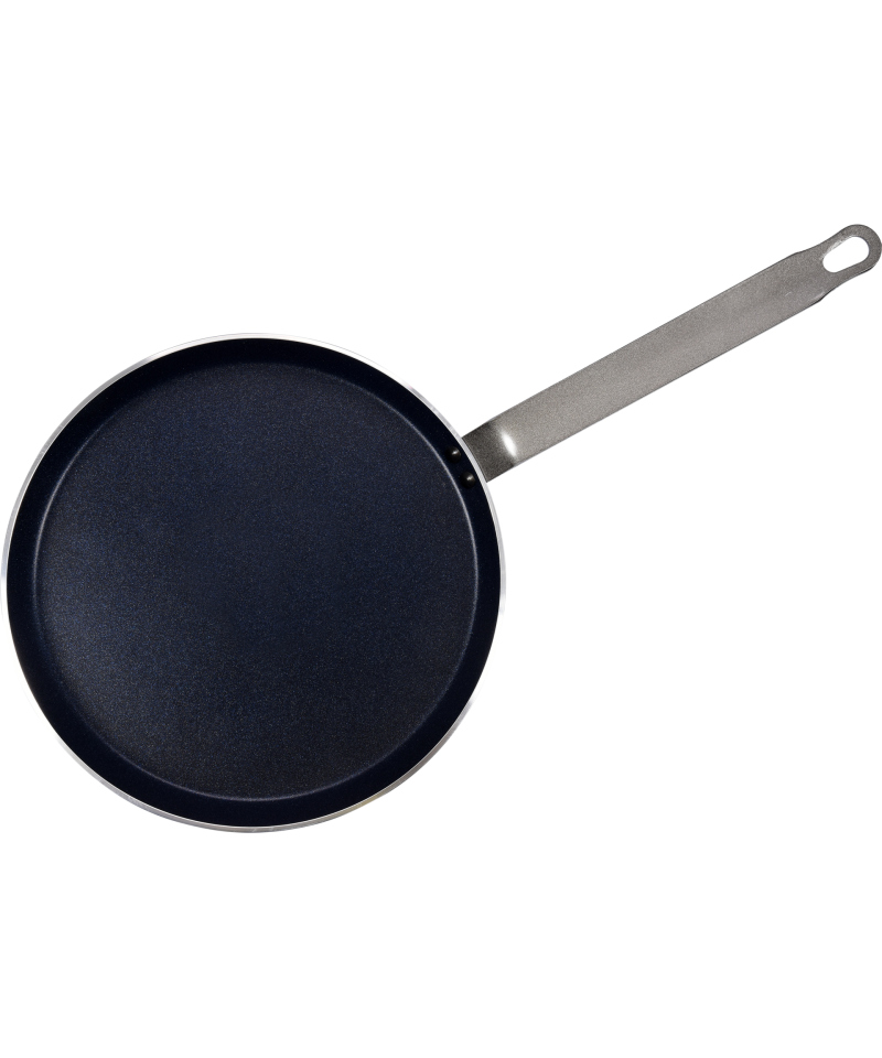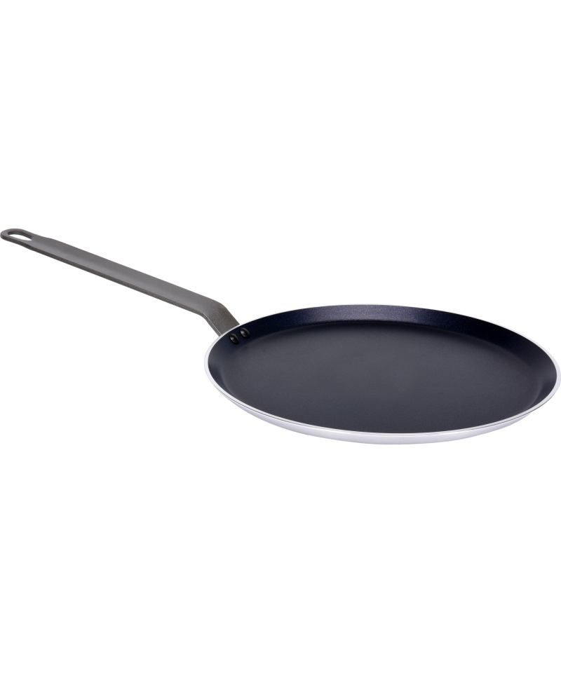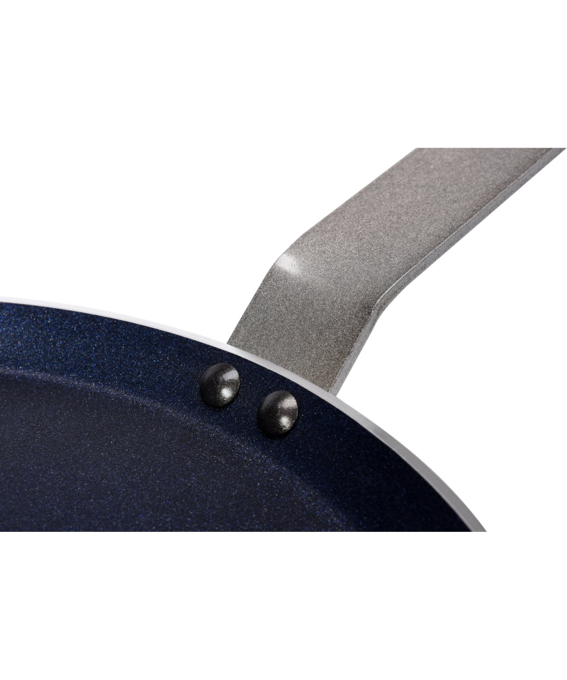 - Ergonomiczna rękojeść została wykonana ze stali epoksydowanej i solidnie połączona z korpusem patelni za pomocą dwóch wytrzymałych nitów, co zapewnia stabilność i bezpieczeństwo użytkowania.