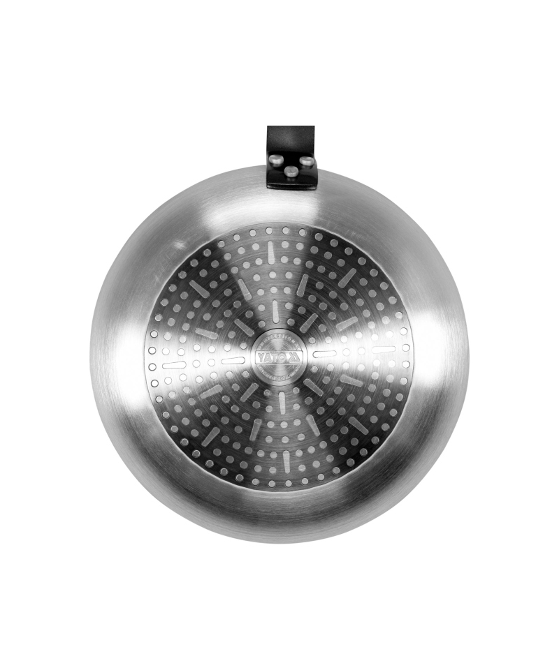 - Solidna rękojeść, wykonana ze stali epoksydowanej, jest trwale połączona z korpusem patelni za pomocą trzech nitów, zapewniając stabilność i bezpieczeństwo użytkowania.