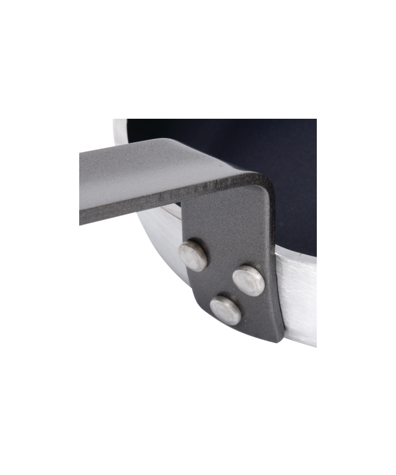 - Solidna rękojeść, wykonana ze stali epoksydowanej, jest trwale połączona z korpusem patelni za pomocą 3 nitów, co zapewnia stabilność i bezpieczeństwo podczas użytkowania.