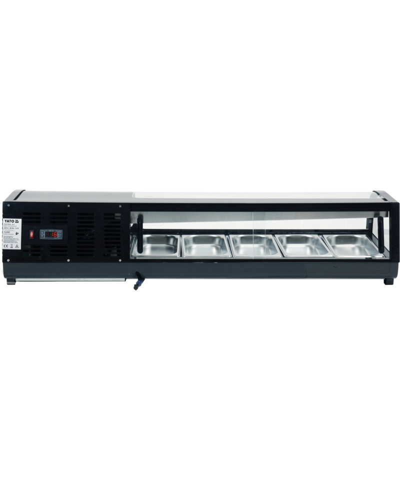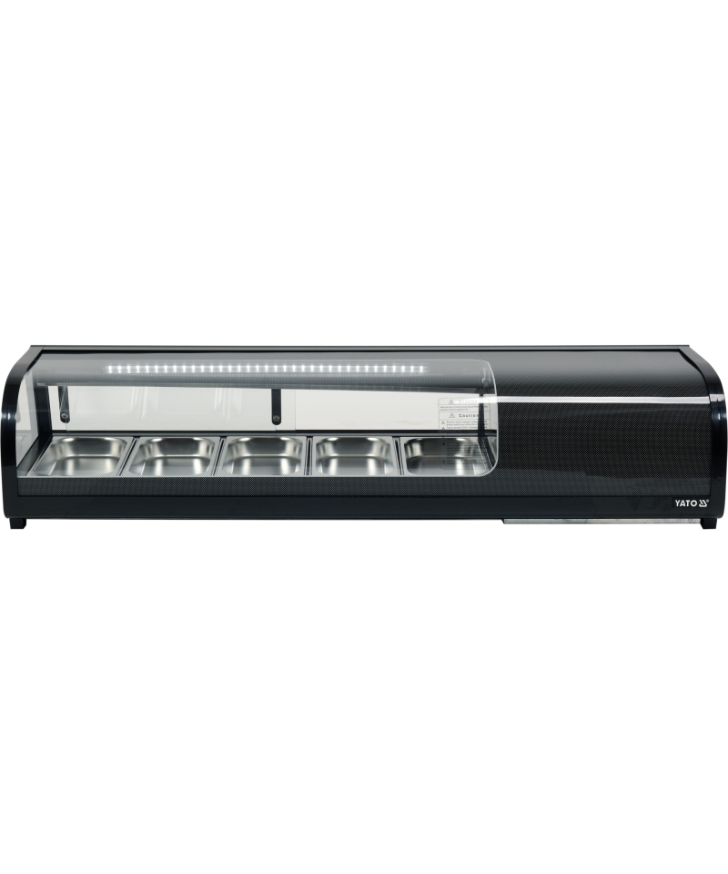 Profesjonalna witryna chłodnicza YATO do sushi 5x1/3GN Witryna chłodnicza marki YATO to idealne rozwiązanie do eleganckiej ekspozycji sushi, tapas oraz różnorodnych przystawek. Jej nowoczesne wzornictwo, w połączeniu z najwyższej jakości materiałami, sprawia, że doskonale wkomponuje się w estetykę każdej restauracji czy hotelu, stając się wizytówką lokalu. Zintegrowane oświetlenie LED efektownie podkreśla świeżość i apetyczny wygląd prezentowanych potraw, skutecznie zachęcając klientów do ich wyboru. Nadstawka chłodnicza YATO została zaprojektowana tak, aby pomieścić 5 pojemników GN 1/3 o głębokości 40 mm, wykonanych ze stali nierdzewnej, które są dołączone do zestawu. Łatwy dostęp do zawartości zapewniają przesuwne drzwiczki ze szkła hartowanego. Zarówno drzwiczki, jak i panoramiczna, zaokrąglona szyba przednia, są wykonane ze szkła hartowanego, co gwarantuje wyjątkową trwałość oraz doskonałe właściwości izolacyjne. Urządzenie pracuje w optymalnym zakresie temperatur od 0 do +12°C, wykorzystując ekologiczny czynnik chłodniczy R600a. Zastosowana technologia chłodzenia statycznego z innowacyjną górną dyszą parową oraz funkcją automatycznego rozmrażania zapewnia nie tylko wysoką efektywność pracy, ale także znaczną energooszczędność. Średnie roczne zużycie energii wynosi zaledwie 881 kWh. Precyzyjne sterowanie witryną odbywa się za pomocą intuicyjnego sterownika elektronicznego z czytelnym wyświetlaczem temperatury.