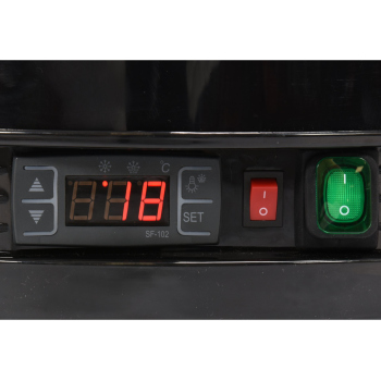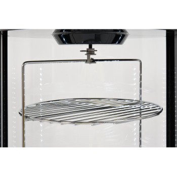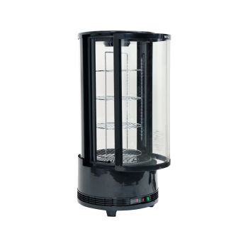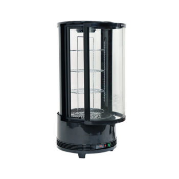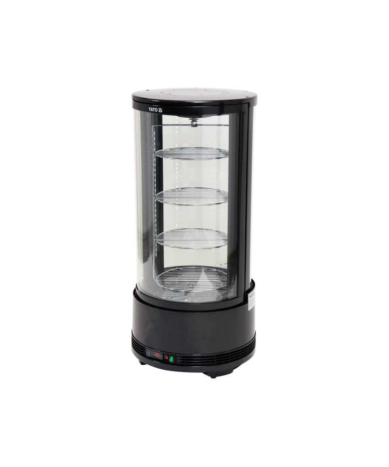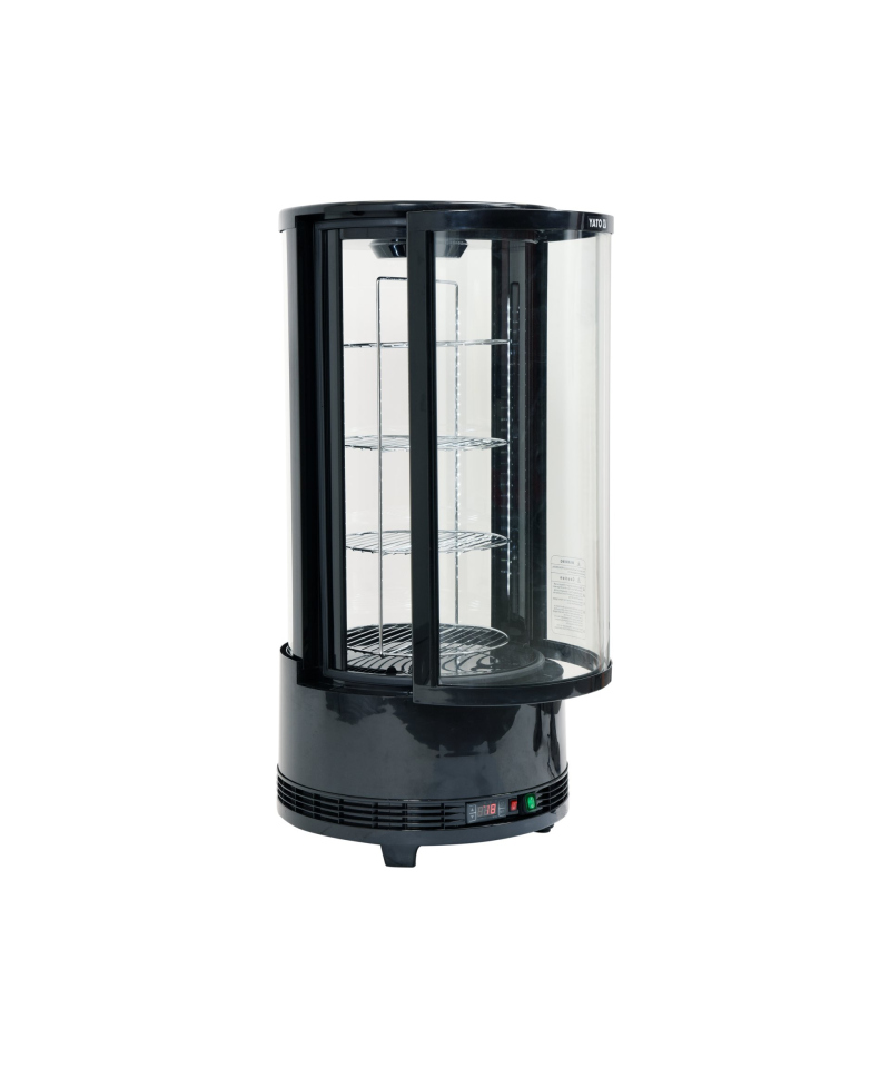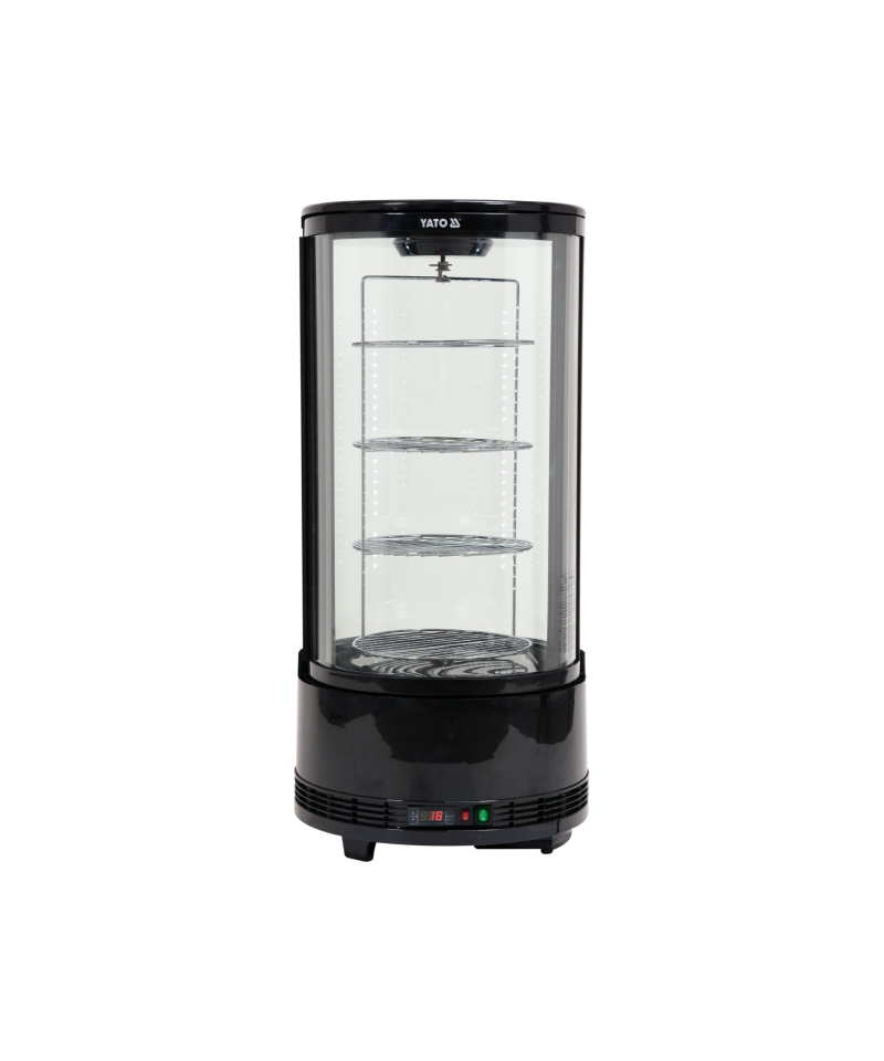 Okrągła witryna chłodnicza YATO o pojemności 73L w eleganckim czarnym kolorze to idealne rozwiązanie do profesjonalnej ekspozycji. Model YG-05090 wyróżnia się innowacyjnymi obrotowymi półkami, których ruch można łatwo kontrolować za pomocą dedykowanego włącznika. Ta witryna chłodnicza marki YATO została zaprojektowana z myślą o atrakcyjnej prezentacji szerokiej gamy produktów, od wykwintnych ciast i tortów, po orzeźwiające koktajle i napoje. Jej nowoczesne wzornictwo, połączone z najwyższą jakością użytych materiałów, sprawia, że witryna YATO stanowi wyrafinowany element wyposażenia, doskonale komponując się z estetyką cukierni, kawiarni, restauracji oraz innych punktów handlowych. Zintegrowane dwustronne oświetlenie LED efektownie podkreśla walory wizualne eksponowanych produktów, skutecznie przyciągając uwagę klientów i zachęcając do zakupu. Ta kompaktowa nadstawka chłodnicza YATO o pojemności 73L oferuje przestronne wnętrze z czterema chromowanymi obrotowymi półkami, maksymalizującymi przestrzeń ekspozycyjną. Łatwy dostęp do produktów zapewniają otwierane szklane drzwiczki. Zarówno one, jak i zaokrąglona szyba przednia, wykonane są z podwójnego szkła hartowanego, co gwarantuje wyjątkową trwałość oraz doskonałe właściwości termoizolacyjne. Urządzenie utrzymuje optymalny zakres temperatur od +2°C do +12°C, wykorzystując ekologiczny czynnik chłodniczy R600a. Zastosowanie zaawansowanej technologii chłodzenia wymuszonego w połączeniu z funkcją automatycznego rozmrażania gwarantuje niezwykle efektywną i energooszczędną pracę urządzenia. Jej średnie roczne zużycie energii wynosi zaledwie 1435 kWh, co podkreśla jej ekonomiczność. Intuicyjne sterowanie odbywa się za pośrednictwem precyzyjnego sterownika elektronicznego, wyposażonego w czytelny wyświetlacz temperatury.