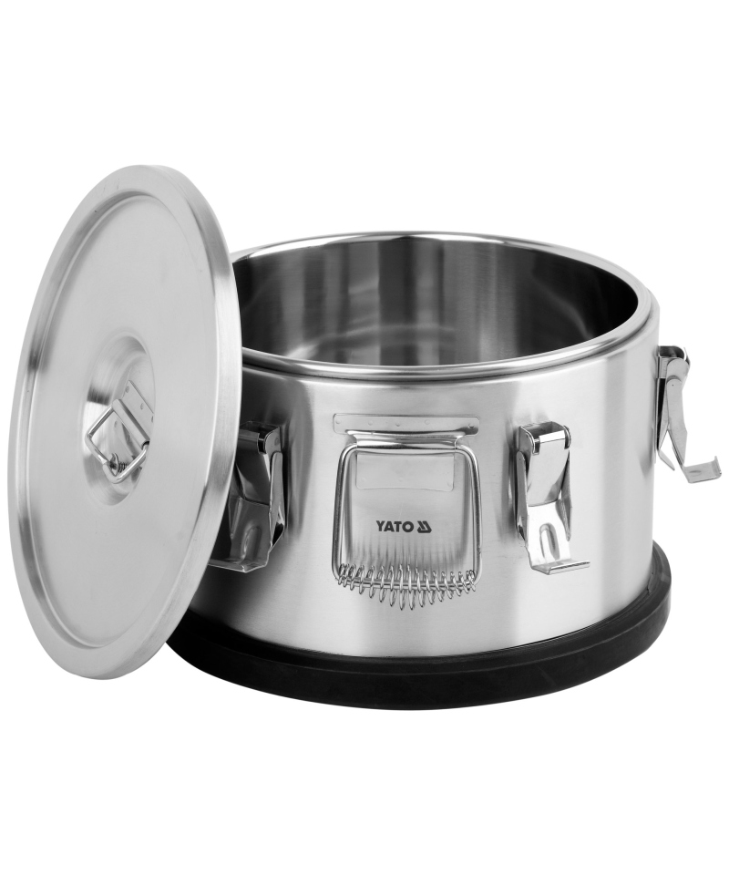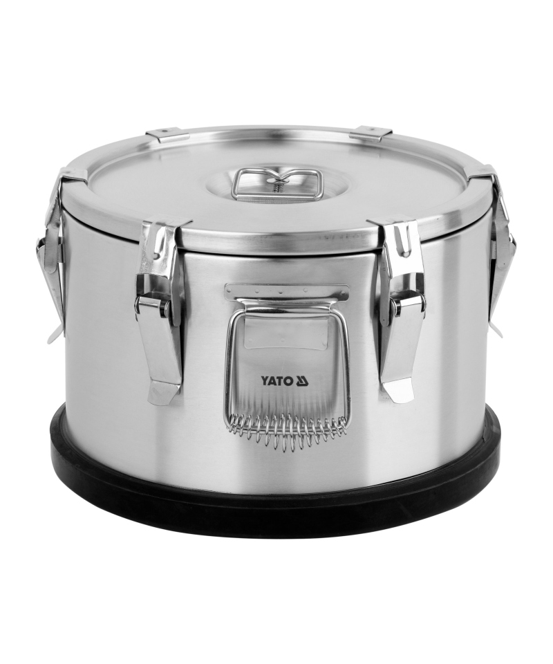 Dla maksymalnej wygody i bezpieczeństwa, pojemnik termoizolacyjny wyposażono w dwa solidne, wykonane ze stali nierdzewnej, masywne uchwyty transportowe oraz sześć trwałych zatrzasków pewnie zamykających pokrywę. Niezwykła jakość i wytrzymałość tych komponentów zapewniają długie lata niezawodnej eksploatacji. Dodatkowo, spód termosów YATO został zabezpieczony gumową osłoną antypoślizgową, która skutecznie stabilizuje pojemnik i zapobiega jego przesuwaniu się podczas transportu.