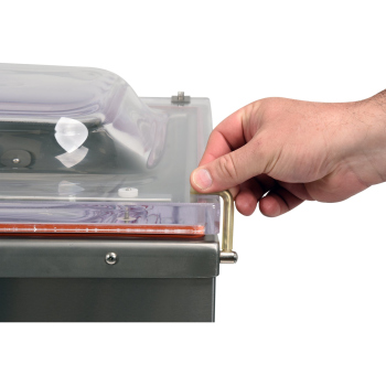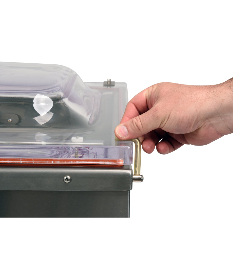 - Pokrywa pakowarki, wykonana z niezwykle wytrzymałego, transparentnego tworzywa sztucznego, pozwala na bieżące monitorowanie procesu pakowania, zapewniając pełną kontrolę wizualną.