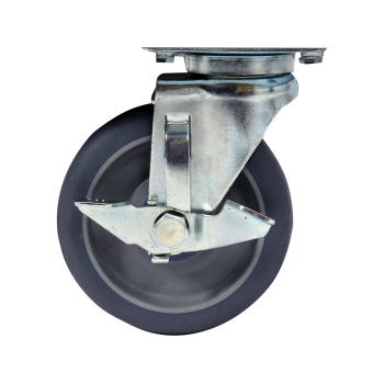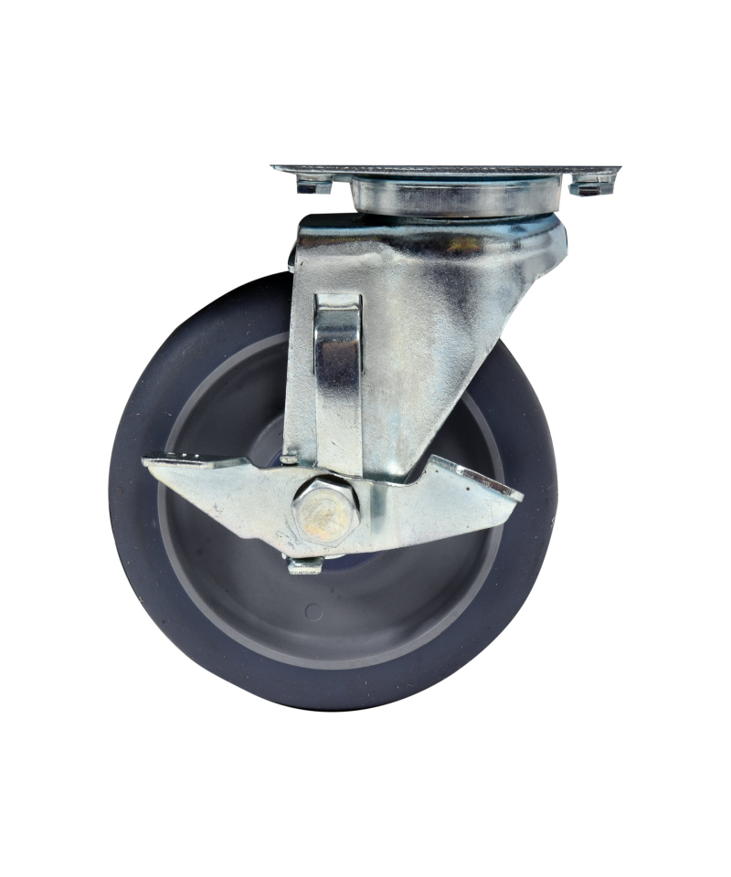 Wózek wyposażono w cztery innowacyjne kółka z materiału TPI, które wyróżniają się wyjątkową miękkością. Skutecznie absorbują one drgania i redukują hałas, zapewniając płynny i cichy transport nawet po nierównych czy twardych nawierzchniach. Ich szary kolor to gwarancja, że nie pozostawiają żadnych śladów na podłożu, co czyni je idealnym rozwiązaniem do użytku wewnątrz pomieszczeń – na posadzkach betonowych, terakotowych czy delikatnych podłogach drewnianych. Dodatkowo, dwa kółka są skrętne, co umożliwia niezwykle precyzyjne i swobodne manewrowanie wózkiem, nawet w najbardziej ograniczonych przestrzeniach, takich jak wąskie przejścia, drzwi czy ciasne korytarze.