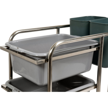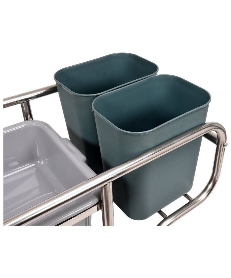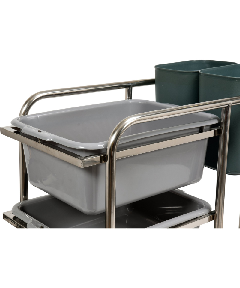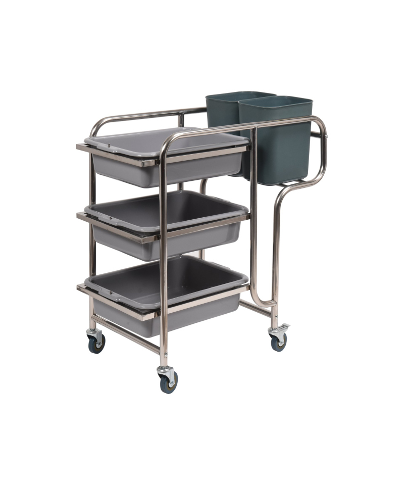 - Ten wszechstronny wózek, wraz z kompletem pięciu pojemników, został zaprojektowany z myślą o efektywnym zbieraniu i transporcie naczyń stołowych.
