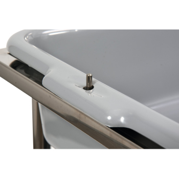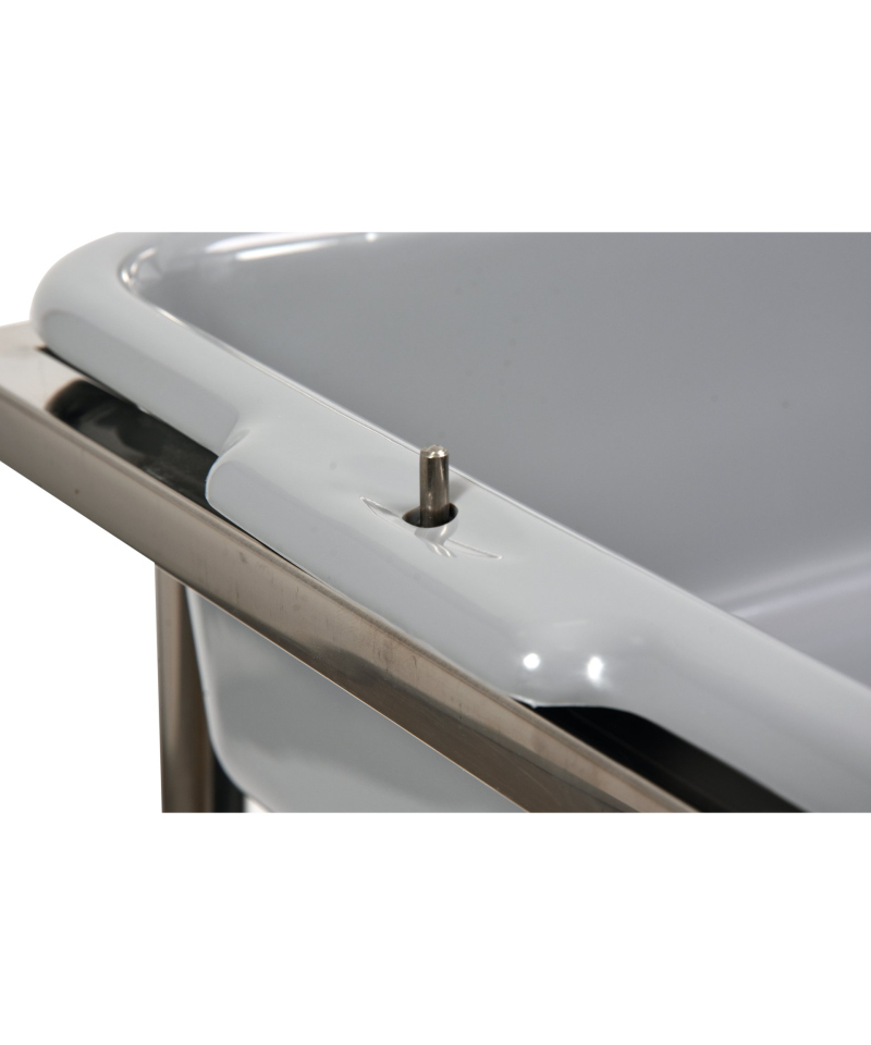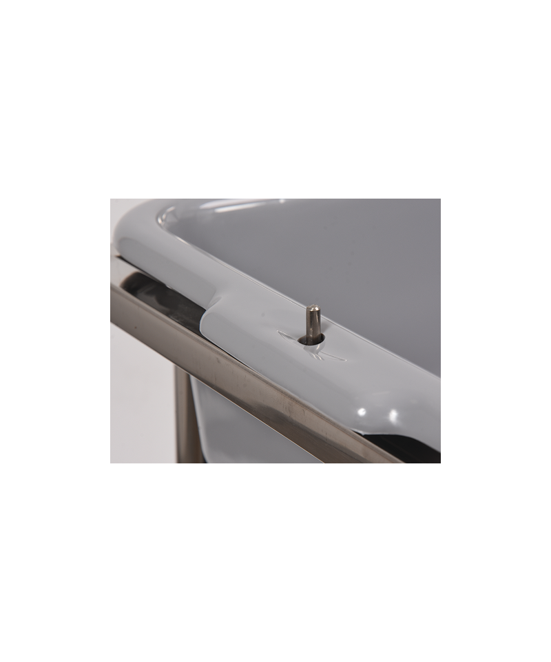 - Konstrukcja wózka opiera się na solidnych, okrągłych profilach wykonanych z wysokiej jakości stali nierdzewnej, co gwarantuje wyjątkową odporność na korozję oraz łatwość w utrzymaniu higieny i czystości.