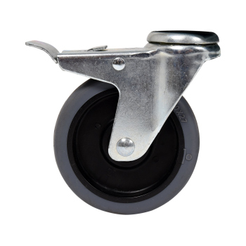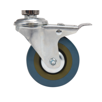Dla maksymalnej mobilności i komfortu użytkowania, wózek wyposażono w 4 solidne kółka z łożyskami, wykonane z wysokiej jakości szarego tworzywa TPR. To innowacyjne połączenie twardości i elastyczności materiału gwarantuje niezwykle cichą pracę oraz płynne przemieszczanie. Kółka są całkowicie bezpieczne dla podłóg – nie rysują posadzki i nie pozostawiają na niej żadnych śladów. Ich pełna skrętność w zakresie 360° znacząco ułatwia manewrowanie w ciasnych pomieszczeniach i wąskich korytarzach. Dodatkowo, dla zwiększenia bezpieczeństwa i stabilności, dwa z kółek zostały wyposażone w niezawodne hamulce.