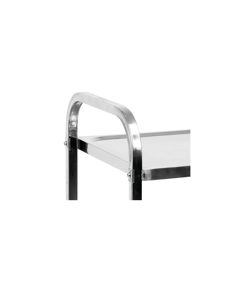 Dwie obszerne półki o wymiarach 890 x 495 mm zostały wyposażone w specjalny rant, który efektywnie zabezpiecza transportowane produkty przed ześlizgnięciem się podczas przewożenia. Wszystkie krawędzie wózka są starannie zaokrąglone, co znacząco podnosi bezpieczeństwo użytkowania, minimalizując ryzyko urazów.