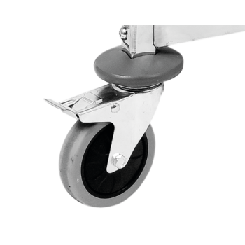Wózek został osadzony na 4 solidnych kółkach z łożyskami, wykonanych z wysokogatunkowego szarego TPR. Wykorzystanie tego twardego, lecz elastycznego materiału gwarantuje wyjątkowo cichą i płynną pracę. Kółka są całkowicie bezpieczne dla podłóg – nie rysują ich i nie pozostawiają żadnych śladów, a ich pełna skrętność (360°) znacząco ułatwia manewrowanie. Pozwala to na precyzyjne przemieszczanie wózka nawet w ciasnych przestrzeniach i wąskich korytarzach. Dla zwiększenia stabilności i bezpieczeństwa, dwa z kółek zostały dodatkowo wyposażone w niezawodne hamulce.