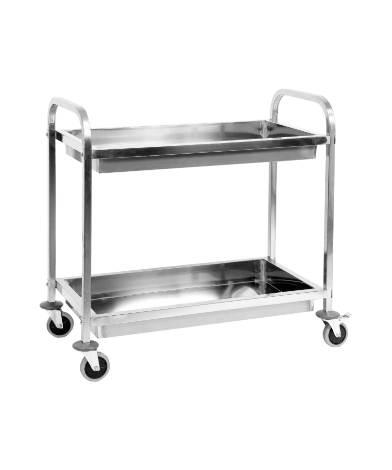 Konstrukcja wózka opiera się na wysokiej jakości stali nierdzewnej typu 201, co gwarantuje nie tylko wyjątkową odporność na korozję, ale także łatwość w utrzymaniu higieny i długotrwałe, bezproblemowe użytkowanie – również w warunkach zewnętrznych. Komfort pracy podnoszą maty dźwiękochłonne, umieszczone pod każdą półką. Wykonane ze specjalnej pianki, skutecznie tłumią drgania i hałas generowany podczas transportu, zapewniając cichą i płynną pracę. Dwie przestronne półki, każda o wymiarach 820 x 430 mm i głębokości 90 mm, wyposażono w podwyższony rant, który efektywnie zabezpiecza przewożone produkty przed ześlizgnięciem. Dodatkowo, wszystkie krawędzie wózka zostały starannie zaokrąglone, co znacząco zwiększa bezpieczeństwo personelu podczas codziennej eksploatacji.