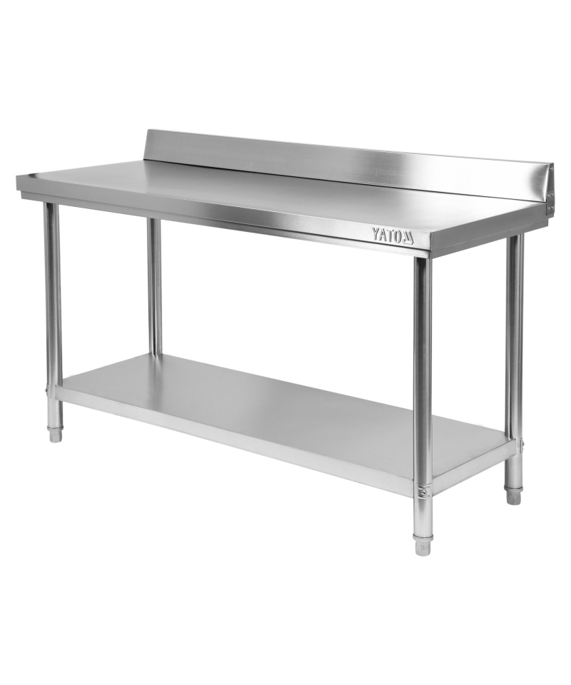 Solidny blat stołu, wykonany z wytrzymałej blachy o grubości 0,8 mm, został wzmocniony dodatkowymi profilami dla maksymalnej stabilności. Od spodu blat zabezpieczono drewnianą płytą laminowaną o grubości 20 mm, która nie tylko usztywnia konstrukcję i redukuje hałas, ale także zapewnia odporność na wilgoć. Takie rozwiązania gwarantują imponującą nośność do 150 kg. Dodatkowo, praktyczny rant tylny o wysokości 100 mm skutecznie zapobiega wpadaniu resztek za stół po jego przystawieniu do ściany, znacząco podnosząc standardy higieny w miejscu pracy.