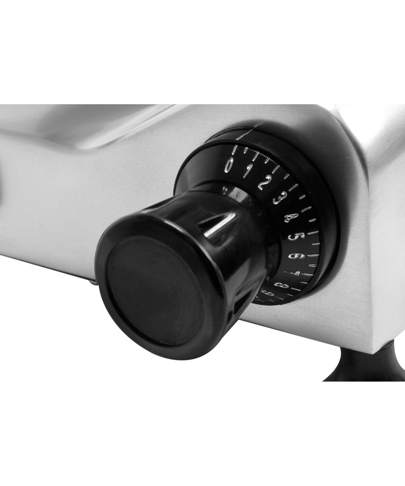 Wytrzymała tarcza tnąca o średnicy 220mm bez trudu radzi sobie z produktami o średnicy do 150mm. Dzięki innowacyjnej płynnej regulacji grubości krojenia, użytkownik ma pełną kontrolę nad precyzją, uzyskując idealne plastry o grubości od 0,2 do 12mm.