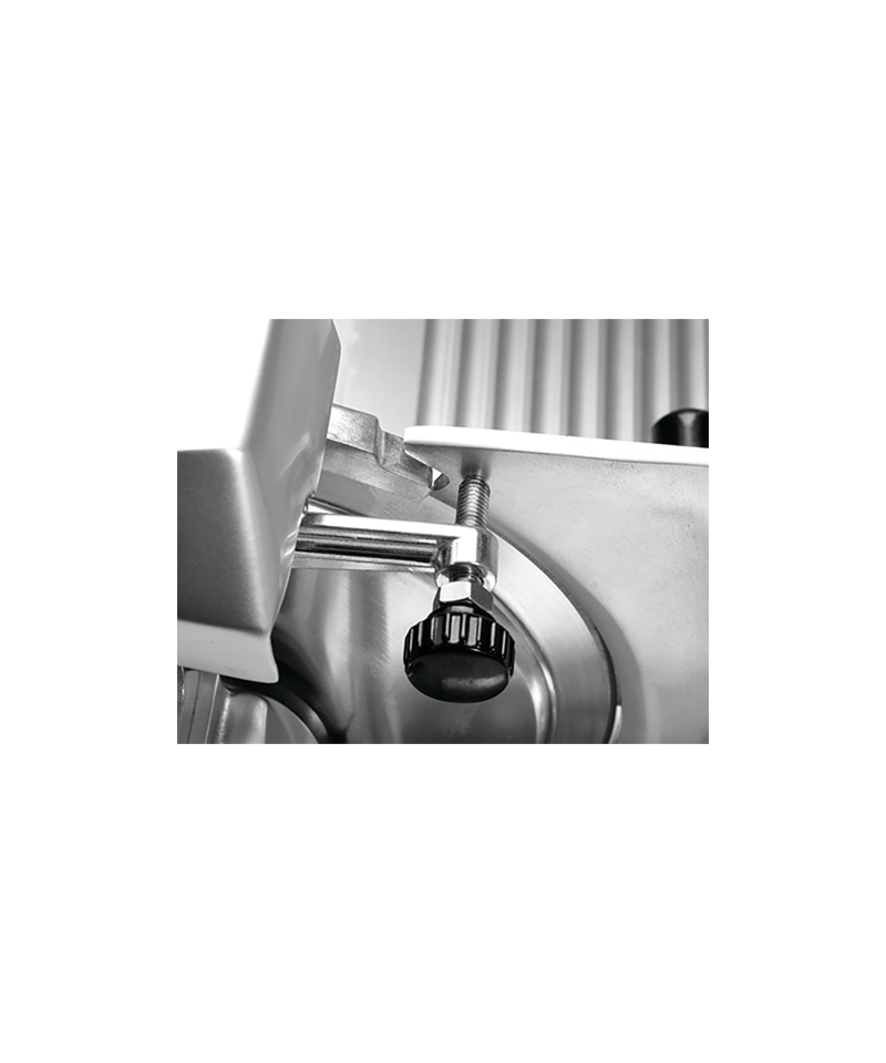 Wózek, osadzony na precyzyjnych prowadnicach z łożyskami, charakteryzuje się niezwykle lekką i płynną pracą, co minimalizuje wysiłek operatora podczas krojenia. Co więcej, cały mechanizm tnący – zarówno wózek, jak i tarcza – został ukośnie ustawiony. Dzięki temu innowacyjnemu rozwiązaniu, krojone produkty są naturalnie dociskane do tarczy siłą grawitacji, co znacząco zmniejsza wymaganą siłę nacisku i zwiększa komfort użytkowania.