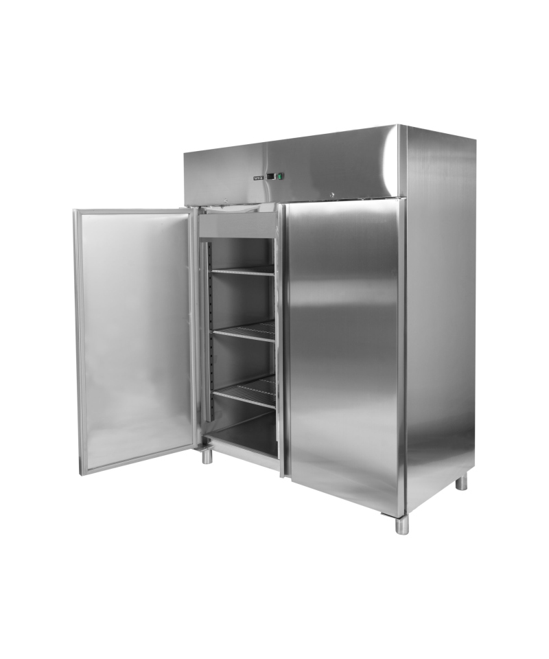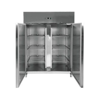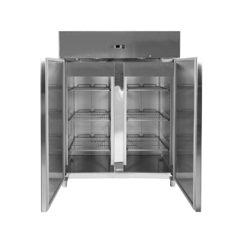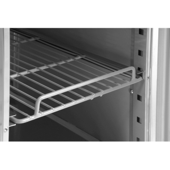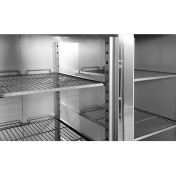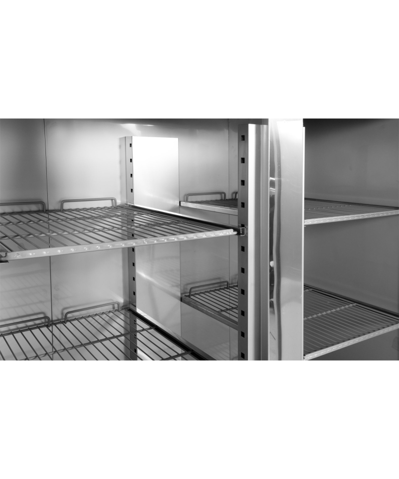 Ten model wyróżnia się praktycznymi, samozamykającymi się drzwiami, które dla dodatkowego bezpieczeństwa wyposażono w solidny zamek oraz ergonomiczny uchwyt. Wewnątrz, na każde drzwi przypada po 3 wytrzymałe półki rusztowe powlekane PVC, każda o imponującej nośności do 40kg (przy równomiernym obciążeniu). Półki te są idealne do przechowywania pojemników GN 2/1. Wnętrze komory chłodniczej jest jasno oświetlone, co ułatwia szybkie odnalezienie produktów.