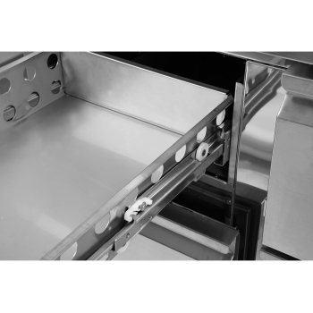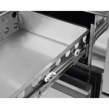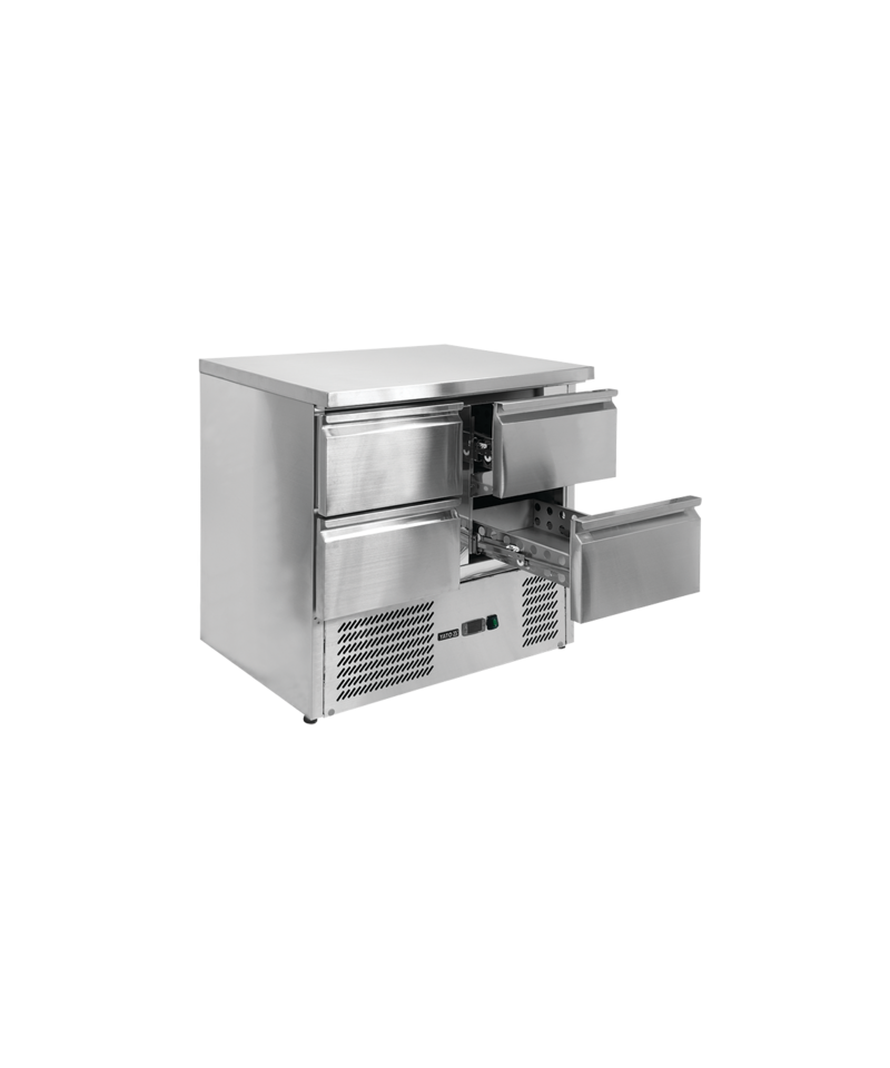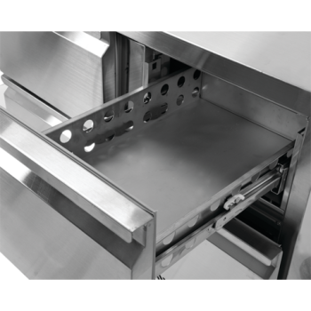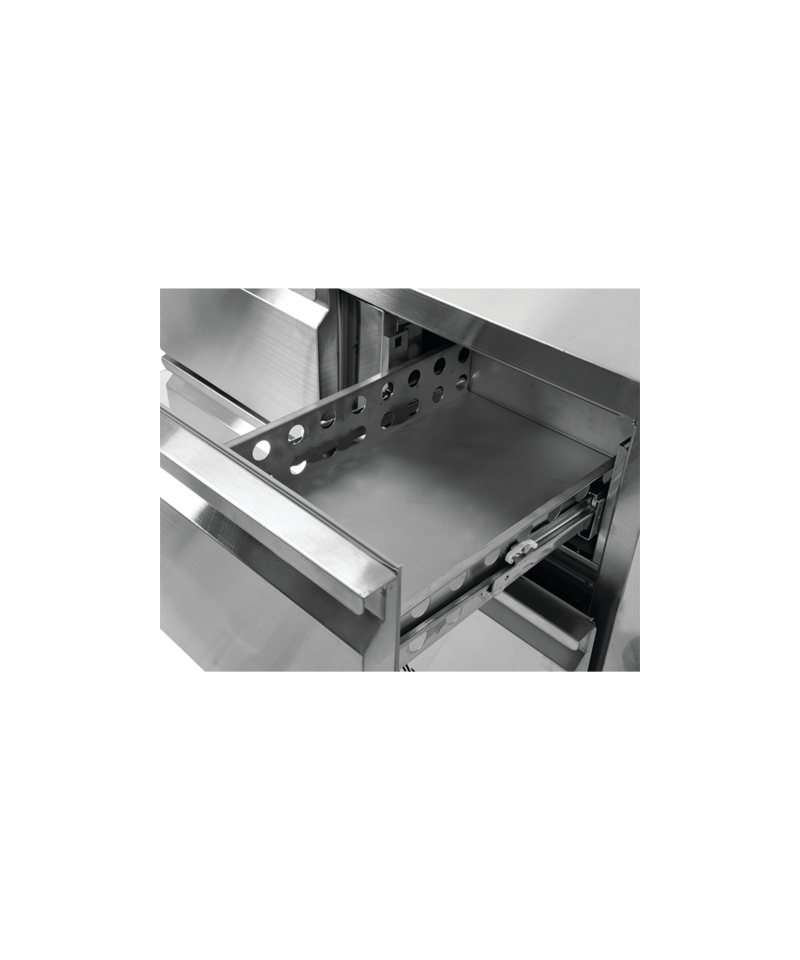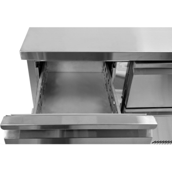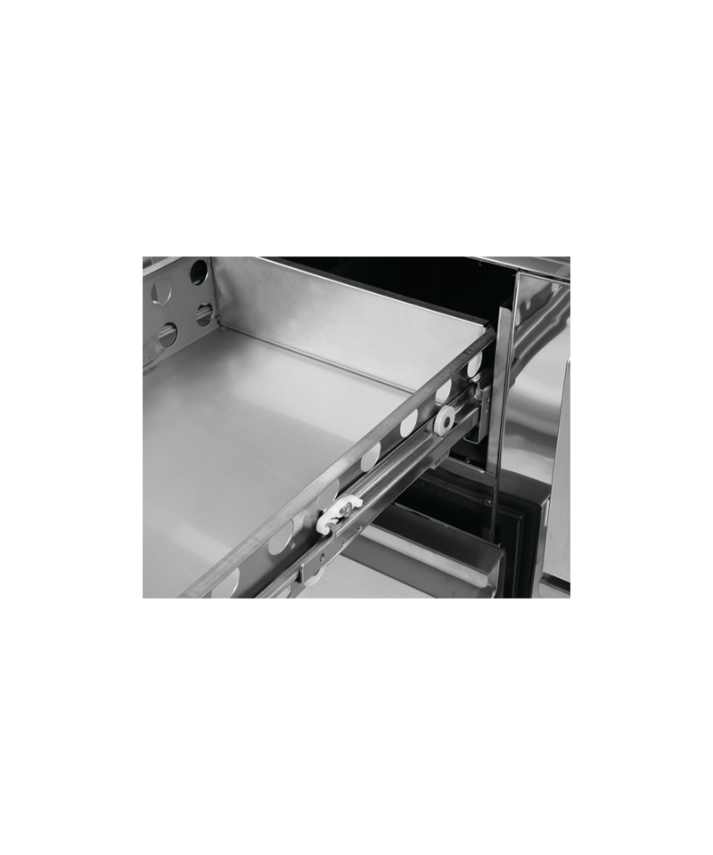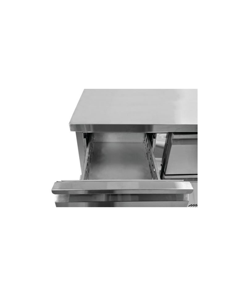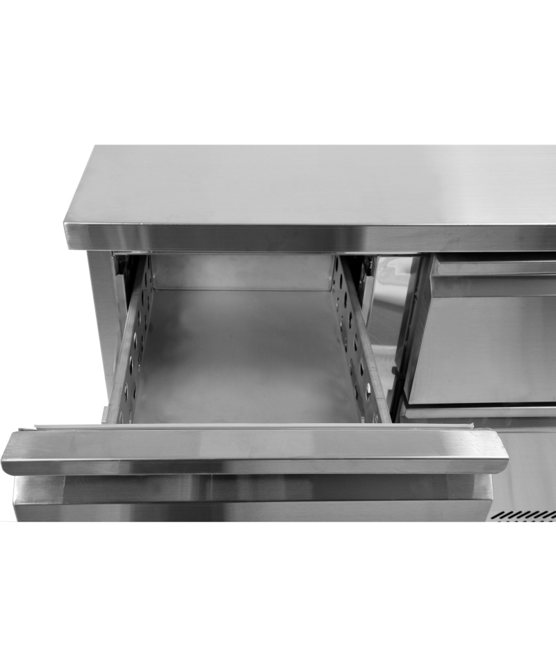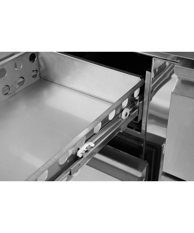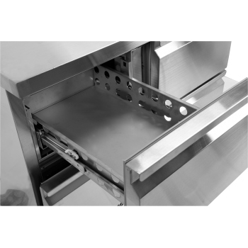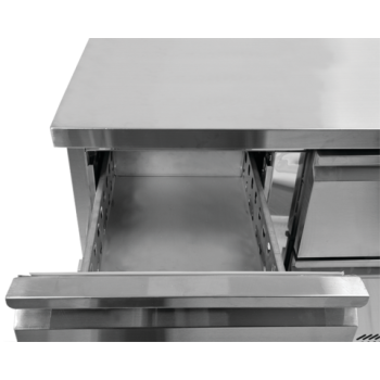 Ten model wyróżnia się 4 samozamykającymi się szufladami, wyposażonymi w ergonomiczne uchwyty, co zapewnia komfort użytkowania i efektywną organizację przestrzeni. Szuflady są idealnie przystosowane do przechowywania pojemników GN 1/1, a także butelek o maksymalnej wysokości 150 mm, oferując wszechstronne możliwości magazynowania.
