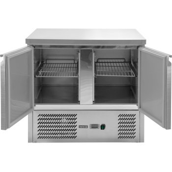Profesjonalny stół chłodniczy dwudrzwiowy z solidnym blatem roboczym, model YATO YG-05270, to idealne rozwiązanie dla gastronomii.