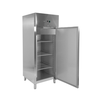 Szafa chłodnicza EN 400x600 z wymuszonym obiegiem powietrza, z automat. odszranianiem i odparowaniem kondensatu gorącym gazem, z regulacją z wyświetlaczem cyfrowym. Centralne chłodzenie z odpływem kondensatu. Higienicznie wykonane wnętrze z zaokrąglonymi krawędziami i wytłaczaną podłogą. Parownik umieszczony poza komorą chłodniczą. Agregat w formie monobloku umieszczony na górze urządzenia.