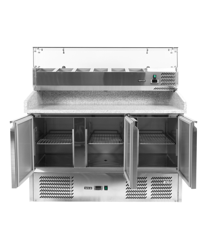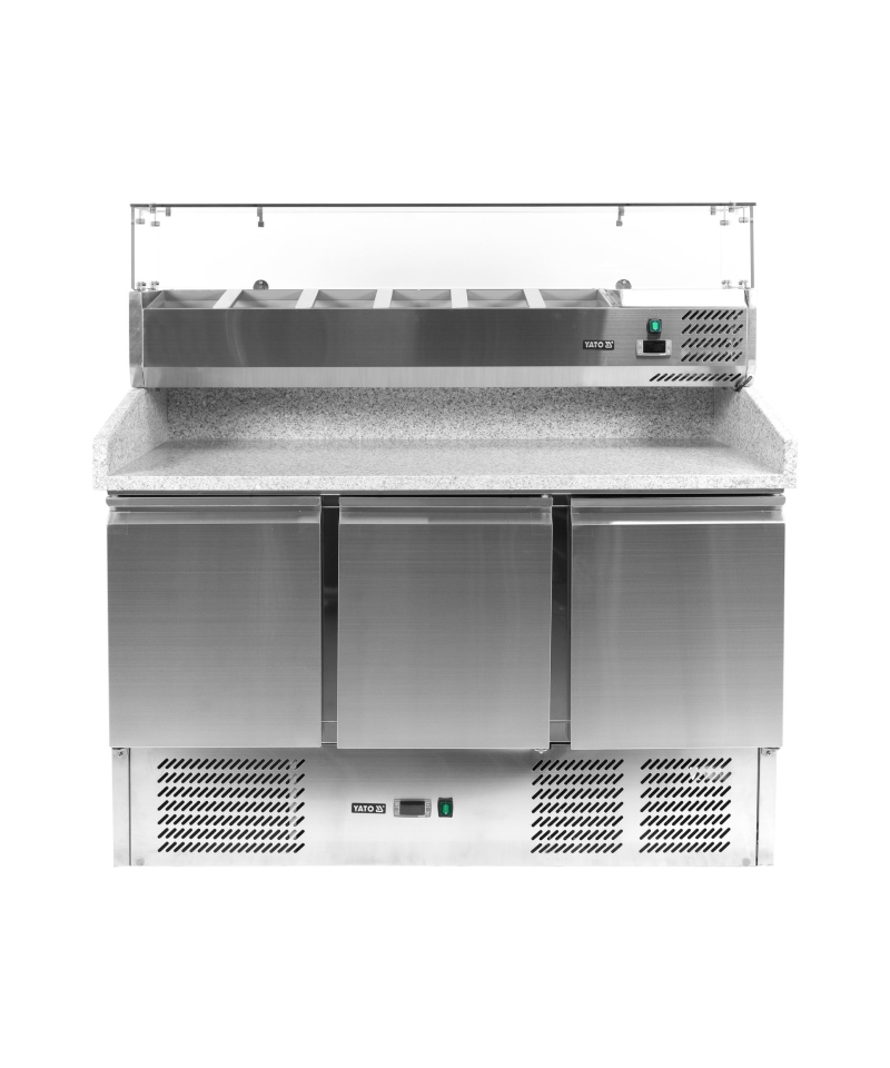 Prezentujemy 3-drzwiowy stół chłodniczy marki YATO, model YG-05275, wyposażony w solidny blat roboczy z granitu oraz praktyczną nadstawkę na 6 pojemników GN 1/4.