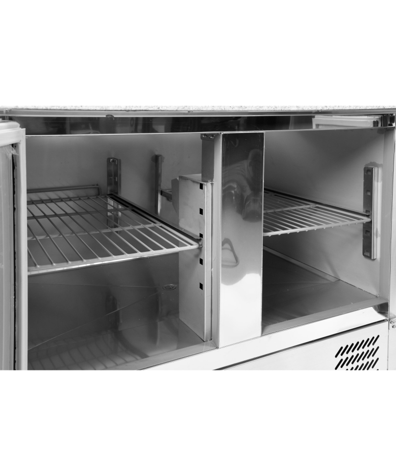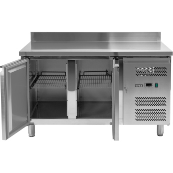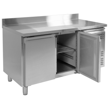 2-drzwiowy stół chłodniczy dostosowany do blach piekarniczych EN 600x400mm EN4060, blat z rantem tylnym h=50 mm (typ C), parownik umieszczony na górze wewnątrz urządzenia, wysokowydajny system wymuszonego obiegu powietrza, automatyczne odszranianie i odparowanie kondensatu za pomocą gorącego gazu, elektroniczny sterownik, higieniczne wykonanie, gotowy do podłączenia.