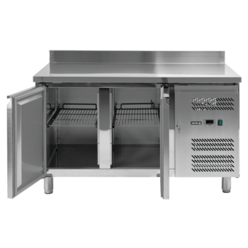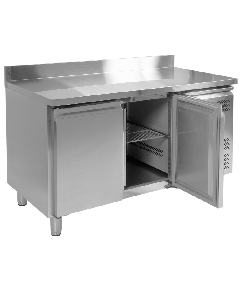 2-drzwiowy stół chłodniczy dla GN 2/3, blat z rantem tylnym h=50 mm (typ C), parownik umieszczony na górze wewnątrz urządzenia, wymuszony obieg powietrza, automatyczne odszranianie i odparowanie kondensatu za pomocą gorącego gazu, elektroniczny sterownik, higieniczne wykonanie, gotowy do podłączenia.
