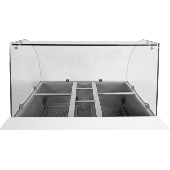 Funkcjonalność stołu podnosi praktyczny blat pomocniczy wykonany z trwałego polietylenu. Dodatkowo, w górnej części znajduje się specjalnie zaprojektowany otwór na pojemniki GN: 4x GN 1/2 oraz 3x GN 1/6, o maksymalnej głębokości 150 mm. To rozwiązanie umożliwia wygodne i zorganizowane przechowywanie szerokiej gamy dodatków i składników do sałatek, zawsze pod ręką. Należy pamiętać, że pojemniki GN nie są częścią zestawu.