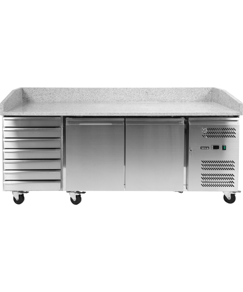 Odkryj niezawodny stół chłodniczy YATO YG-05275, wyposażony w dwie komory drzwiowe i siedem praktycznych szuflad, z eleganckim i trwałym blatem roboczym z granitu.