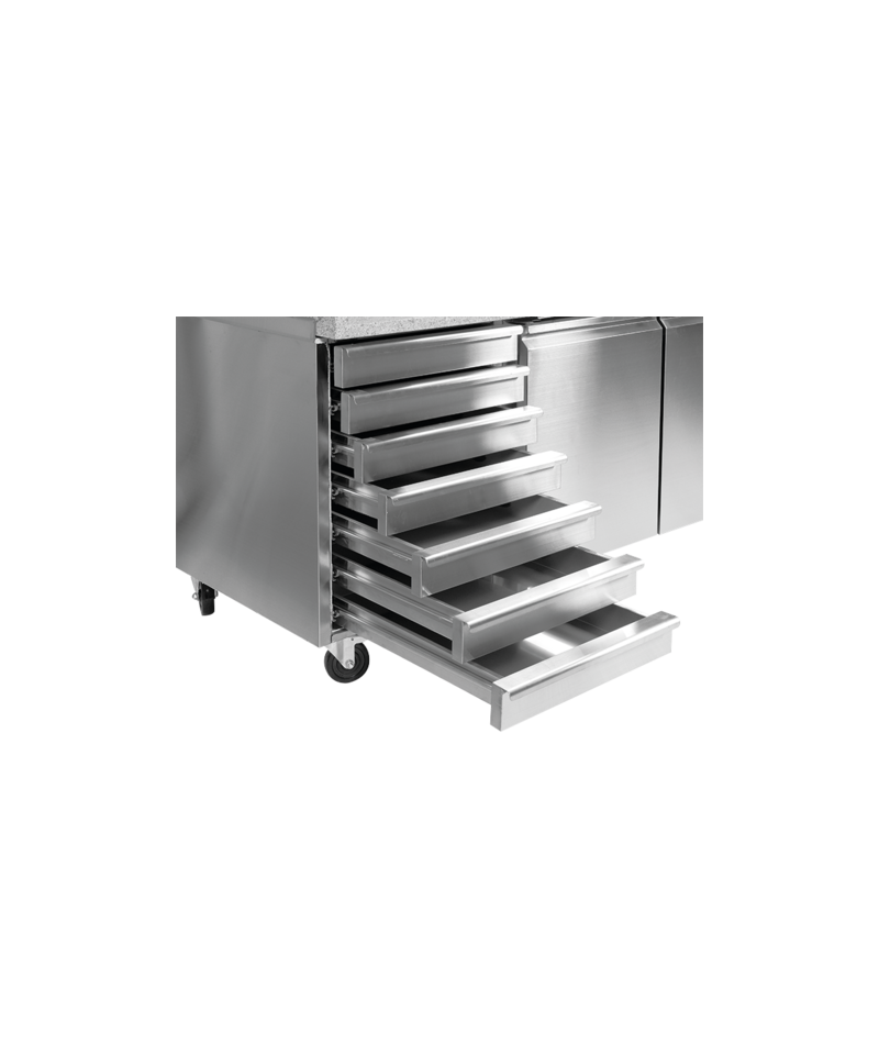 Ten model wyróżnia się samozamykającymi się drzwiami z ergonomicznymi uchwytami, co zwiększa komfort użytkowania i efektywność energetyczną. W każdej komorze drzwiowej znajduje się 1 półka rusztowa powlekana PVC, wytrzymująca obciążenie do 40 kg (przy równomiernym rozłożeniu), idealna do przechowywania pojemników GN 1/1. Dodatkowo, po lewej stronie, umieszczono 7 praktycznych, niechłodzonych szuflad, doskonałych do organizacji akcesoriów, przypraw czy drobnych pojemników, zapewniając łatwy dostęp do niezbędnych narzędzi pracy.