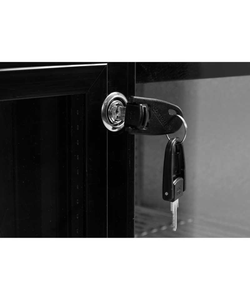 Dwa przesuwne drzwi, wykonane z wysokiej jakości hartowanego szkła, zapewniają doskonałą widoczność i trwałość. Dla dodatkowego bezpieczeństwa, drzwi wyposażono w zamek na kluczyk, chroniący zawartość przed niepowołanym dostępem. Wewnątrz komory znajdują się 4 solidne, chromowane półki, każda o maksymalnej nośności 40 kg (przy równomiernym obciążeniu), co umożliwia elastyczną i efektywną organizację przestrzeni.