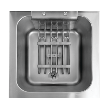 Zbiornik frytownicy charakteryzuje się całkowitą pojemnością wlewczą wynoszącą 16L. Dla optymalnej pracy, minimalny poziom oleju to 9L, a maksymalny, gwarantujący bezpieczne i efektywne smażenie, to 11,5L.