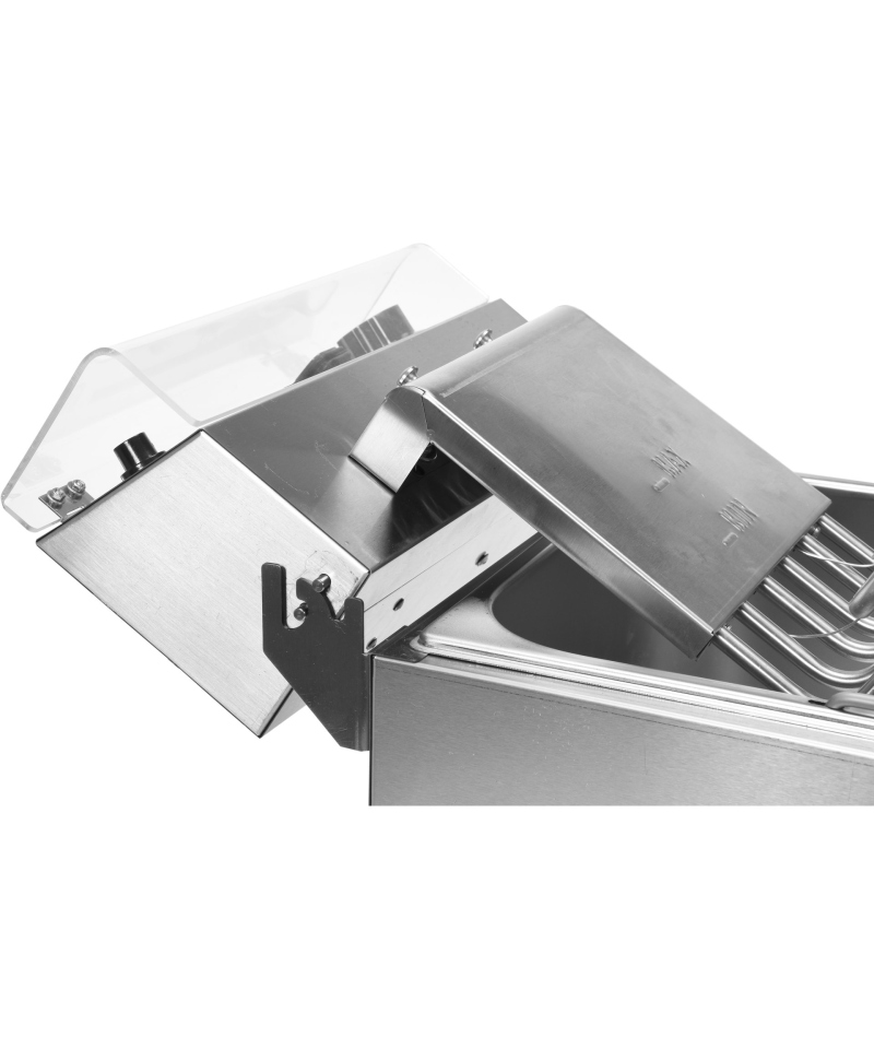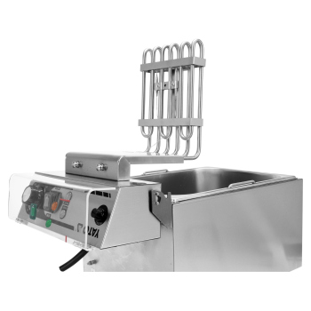 Urządzenie wyposażono w dwie niezależne grzałki, każda o imponującej mocy 5,0kW, sterowane precyzyjnymi potencjometrami umieszczonymi na intuicyjnym panelu sterującym. Umożliwia to płynną regulację temperatury pracy w szerokim zakresie od 60℃ do 200℃. Dla zwiększenia bezpieczeństwa i wygody, zastosowano bryzgoszczelne wyłączniki, pozwalające na bezpieczne odłączenie zasilania bez konieczności wyciągania wtyczki. Co więcej, panel sterujący chroniony jest specjalną osłoną z niezwykle wytrzymałego poliwęglanu, skutecznie zabezpieczającą go przed zachlapaniem olejem podczas intensywnego użytkowania, co znacząco ułatwia utrzymanie czystości. Innowacyjne, wyjmowane grzałki można zawiesić na dedykowanych uchwytach, co pozwala na swobodne ociekanie oleju z powrotem do zbiornika. Frytownica posiada również zaawansowany system bezpieczeństwa, który automatycznie wyłącza grzałkę w momencie jej wyjęcia ze zbiornika oraz chroni urządzenie przed przegrzaniem, aktywując się przy temperaturze przekraczającej 260℃.