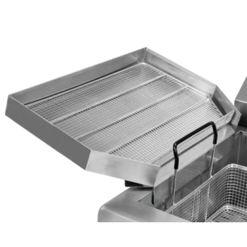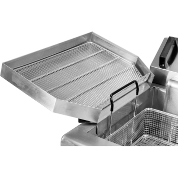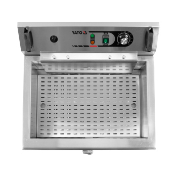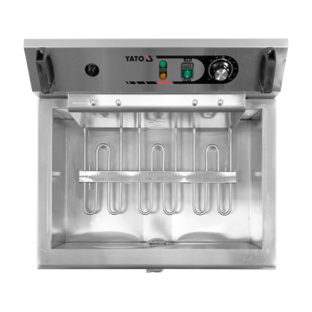 Frytownica YATO wyposażona jest w niezwykle wytrzymały kosz o wymiarach 490x280x100mm, zaopatrzony w ergonomiczne uchwyty boczne. Inteligentne zaczepy umożliwiają zawieszenie kosza bezpośrednio nad zbiornikiem, co skutecznie eliminuje ryzyko zachlapania blatu roboczego olejem. To rozwiązanie znacząco podnosi standardy czystości stanowiska pracy i skraca czas poświęcony na sprzątanie. Dodatkowo, urządzenie posiada praktyczny boczny ociekacz, idealny do odstawiania usmażonych produktów w celu ich ostygnięcia i dokładnego odsączenia z nadmiaru tłuszczu.