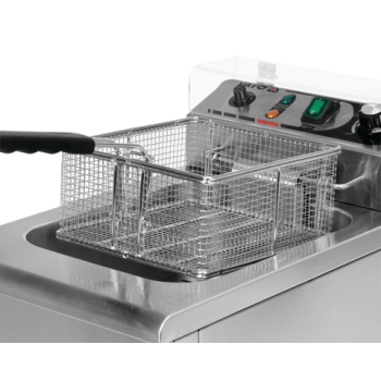 Urządzenie wyposażono w dwie niezależne grzałki, każda o mocy 5,0 kW, sterowane precyzyjnie za pomocą potencjometrów umieszczonych na intuicyjnym panelu sterującym. Umożliwia to płynną regulację temperatury w szerokim zakresie od 60 do 200°C. Zintegrowane, bryzgoszczelne wyłączniki zapewniają bezpieczne odłączenie zasilania bez konieczności wyjmowania wtyczki z gniazdka. Co więcej, panel sterujący jest chroniony specjalną osłoną z niezwykle wytrzymałego poliwęglanu, skutecznie zabezpieczającą go przed zachlapaniem olejem podczas pracy. To znacząco ułatwia utrzymanie frytownicy w nienagannej czystości. Wyjmowane grzałki zostały zaprojektowane tak, aby można je było zawiesić na dedykowanych uchwytach, umożliwiając swobodne ociekanie oleju z powrotem do zbiornika. Dla zwiększenia bezpieczeństwa, frytownica posiada wielostopniowy system zabezpieczeń: automatyczne wyłączenie grzałki po jej wyjęciu ze zbiornika oraz ochronę przed przegrzaniem, aktywującą się przy temperaturze powyżej 260°C.
