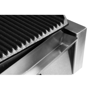 Elegancka i trwała obudowa, wykonana z wysokiej jakości stali nierdzewnej, gwarantuje łatwość czyszczenia i utrzymania higieny, co jest kluczowe w profesjonalnej gastronomii. Dla jeszcze większej wygody, z przodu urządzenia znajduje się praktyczna, wyjmowana rynienka na tłuszcz i resztki po grillowaniu, którą można bez trudu opróżnić i umyć. W zestawie znajdziesz również specjalną miedzianą szczotkę drucianą, idealną do czyszczenia płyty grillowej bez ryzyka zarysowania jej powierzchni. Komfort użytkowania podnosi ergonomiczna, nienagrzewająca się plastikowa rękojeść.