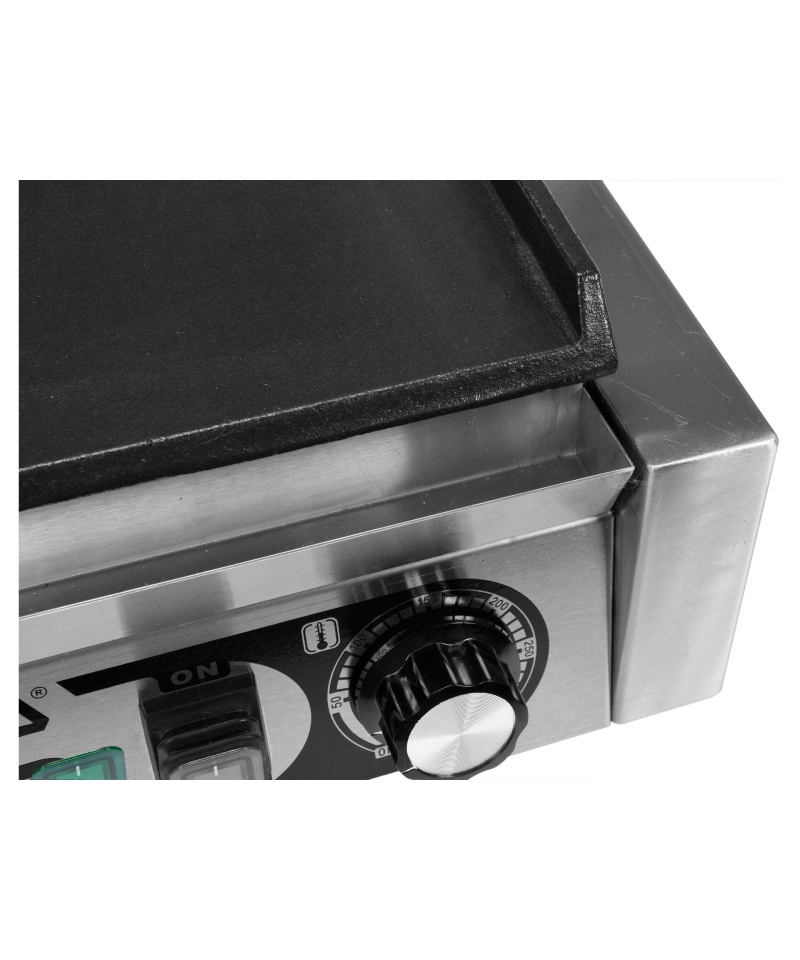 Grzałka o mocy 2,2kW zapewnia szybkie nagrzewanie i jest precyzyjnie sterowana za pomocą intuicyjnego potencjometru, umieszczonego na panelu frontowym. Umożliwia to płynne ustawienie temperatury pracy w szerokim zakresie od 50 do 300℃. Dla zwiększenia bezpieczeństwa i komfortu użytkowania, zainstalowano bryzgoszczelny wyłącznik, który pozwala na odłączenie zasilania grilla, gdy nie jest używany, eliminując potrzebę każdorazowego wyciągania wtyczki z gniazdka. Urządzenie zasilane jest standardowym napięciem 230V~50Hz.