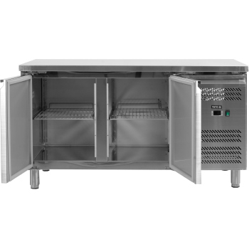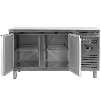 2-drzwiowy stół chłodniczy dla GN 2/3, bez blatu, parownik umieszczony na górze wewnątrz urządzenia, wymuszony obieg powietrza, automatyczne odszranianie i odparowanie kondensatu za pomocą gorącego gazu, elektroniczny sterownik, higieniczne wykonanie, gotowy do podłączenia.