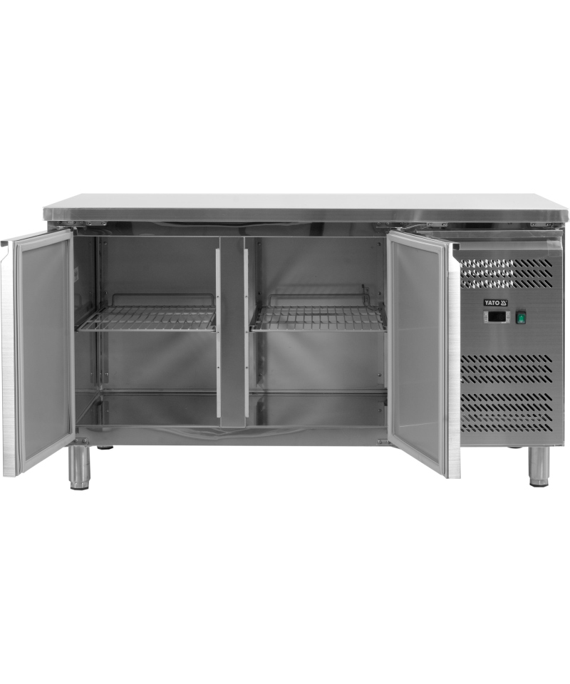 4-drzwiowy stół chłodniczy dla GN 1/1, blat z rantem tylnym h=50 mm (typ C), parownik zapianowany w tylnej ścianie, wysokowydajny system wymuszonego obiegu powietrza, automatyczne odszranianie i odparowanie kondensatu za pomocą gorącego gazu, elektroniczny sterownik, higieniczne wykonanie, gotowy do podłączenia.