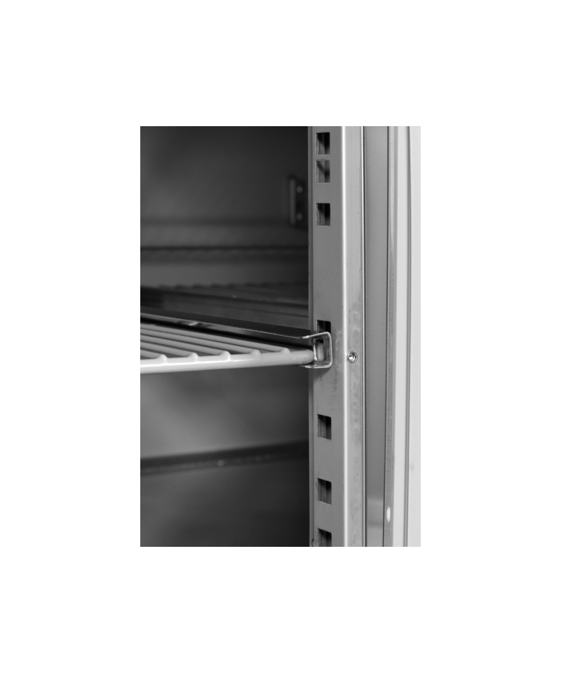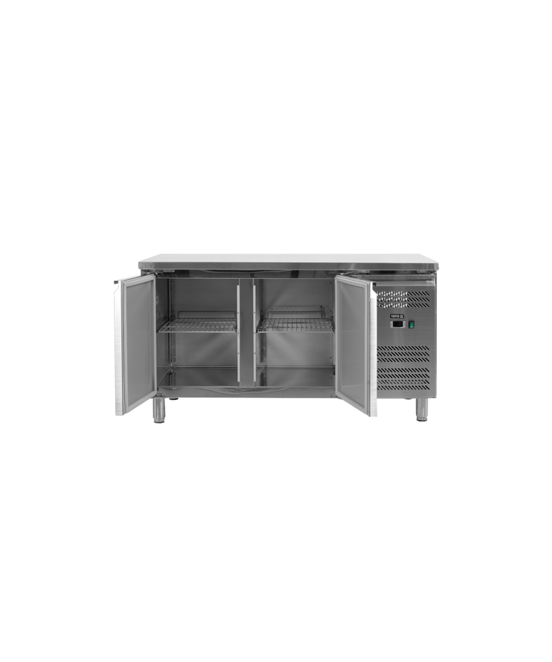 2-drzwiowy stół chłodniczy dla GN 1/1, blat z rantem tylnym h=50 mm (typ C), parownik umieszczony na górze wewnątrz urządzenia, wymuszony obieg powietrza, automatyczne odszranianie i odparowanie kondensatu za pomocą gorącego gazu, elektroniczny sterownik, higieniczne wykonanie, gotowy do podłączenia.