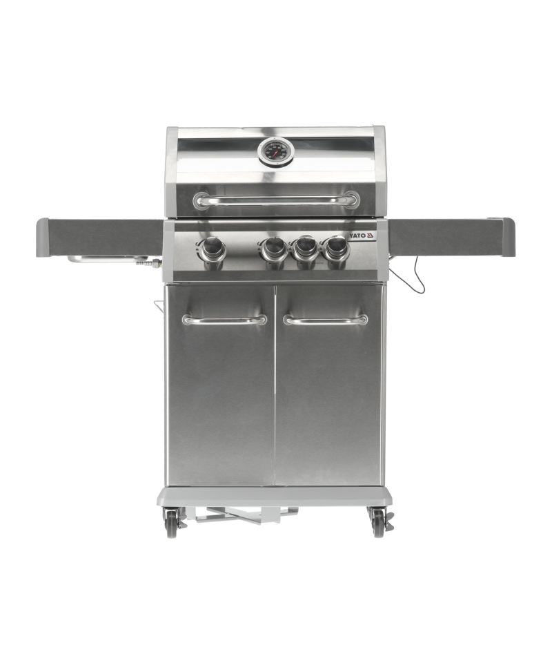Odkryj grill gazowy Yato Itami 3+1, który łączy w sobie nowoczesną stylistykę z niezawodnością stali nierdzewnej. Wyposażony w solidny żeliwny ruszt o imponującej powierzchni 60 x 41,5 cm, gwarantuje doskonałe rezultaty grillowania. Praktyczne półki boczne oraz przestronna, zamykana szafka zapewniają wygodne przechowywanie wszystkich niezbędnych akcesoriów. Dodatkowy palnik boczny o mocy 2,2 kW rozszerza możliwości kulinarne, umożliwiając gotowanie i podgrzewanie potraw w garnku lub na patelni. Komfort użytkowania podnoszą takie udogodnienia jak dedykowane miejsce na butlę gazową, funkcjonalny pojemnik ze stali nierdzewnej zintegrowany z jedną z półek bocznych oraz wbudowany otwieracz do butelek.