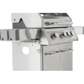 - Przestronna, otwierana szafka z dedykowaną przestrzenią na bezpieczne przechowywanie standardowej polskiej butli gazowej 11 kg, zarówno podczas użytkowania, jak i po zakończeniu grillowania.