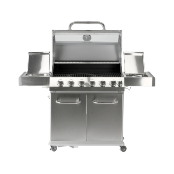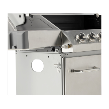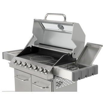 Ten nowoczesny grill gazowy 6+1, wykonany z wysokiej jakości stali nierdzewnej, to kwintesencja funkcjonalności i stylu. Wyposażony w solidny żeliwny ruszt o imponujących wymiarach 82 x 41,5 cm, zapewnia doskonałe warunki do grillowania. Praktyczne półki boczne oraz przestronna, zamykana szafka oferują wygodne miejsce do przechowywania przypraw i wszystkich niezbędnych akcesoriów. Boczny palnik o mocy 2,2 kW rozszerza możliwości kulinarne, umożliwiając gotowanie i podgrzewanie potraw w garnku czy na patelni. Komfort użytkowania podnosi dedykowane miejsce na butlę gazową, elegancki pojemnik ze stali nierdzewnej zintegrowany z jedną z półek bocznych oraz wbudowany otwieracz do butelek, zawsze pod ręką.