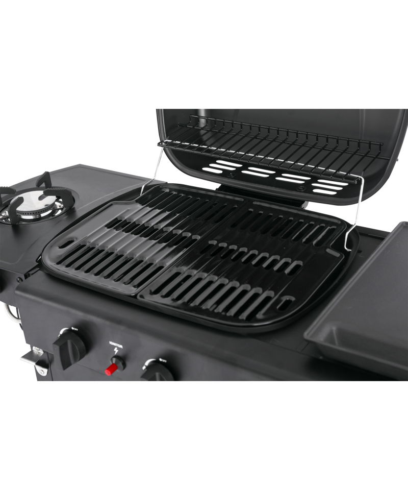 Wyposażony w cztery wysokowydajne palniki, gwarantuje szybkie i równomierne rozprowadzanie ciepła. Obszerny emaliowany ruszt zapewnia mnóstwo przestrzeni do przygotowywania różnorodnych specjałów, a praktyczny palnik boczny umożliwia gotowanie w garnku lub na patelni. Dodatkowa kratka podgrzewająca perfekcyjnie utrzymuje ciepło gotowych dań, by zawsze były idealne do podania.