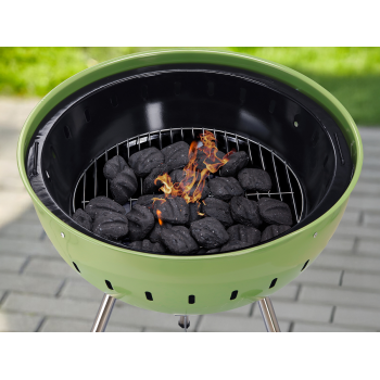 Wewnętrzna galwanizowana kratka na węgiel skutecznie ogranicza bezpośredni kontakt żaru z paleniskiem, co znacząco wydłuża żywotność grilla i umożliwia precyzyjniejszą kontrolę temperatury. Dodatkowo wspiera optymalną cyrkulację powietrza.