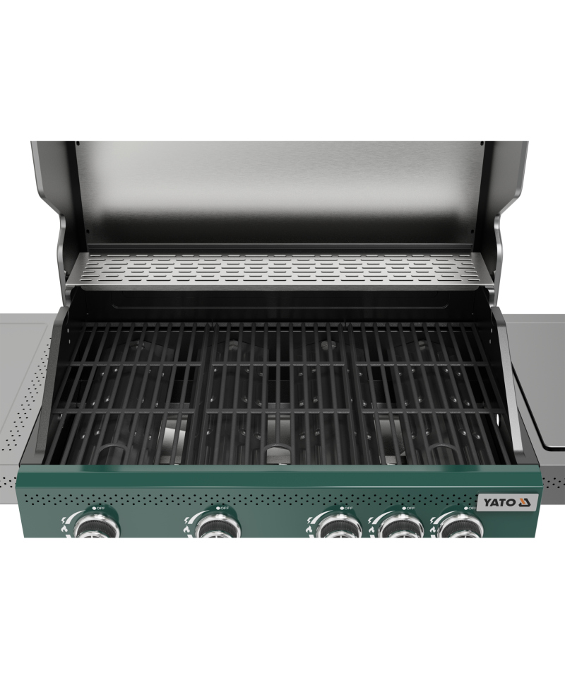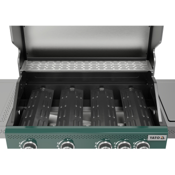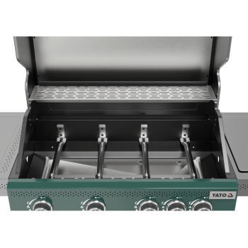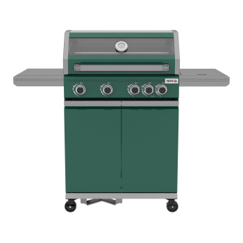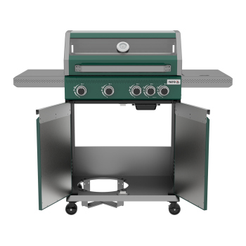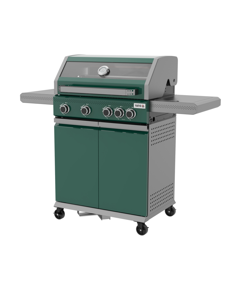 Odkryj nowoczesność i funkcjonalność z grillem gazowym 4 + 1 z ekskluzywnej serii YATO Itami, wyróżniającym się unikalną zielono-szarą kolorystyką. Sercem urządzenia jest niezawodny, żeliwny ruszt o imponującej powierzchni 68 x 42 cm, uzupełniony o praktyczną kratkę podgrzewającą ze stali nierdzewnej. Z łączną mocą palników wynoszącą 14,2 kW, grill gwarantuje doskonałe rezultaty kulinarne. Przemyślane półki boczne oraz pojemna, zamykana szafka zapewniają wygodne przechowywanie przypraw i wszystkich niezbędnych akcesoriów.