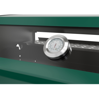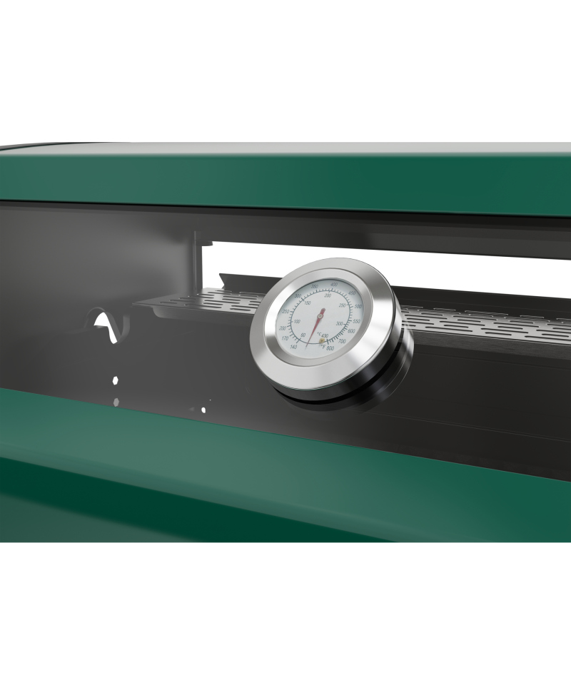 - Zintegrowana z pokrywą 6 mm szyba ze szkła hartowanego, odporna na wysokie temperatury, umożliwiająca wygodne monitorowanie potraw bez konieczności otwierania grilla