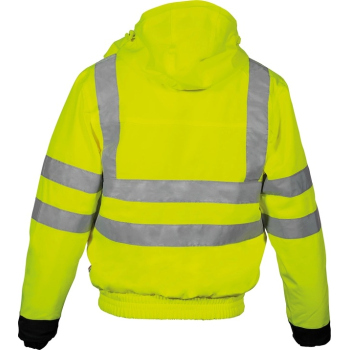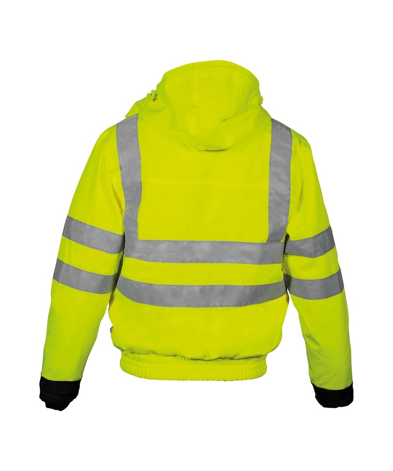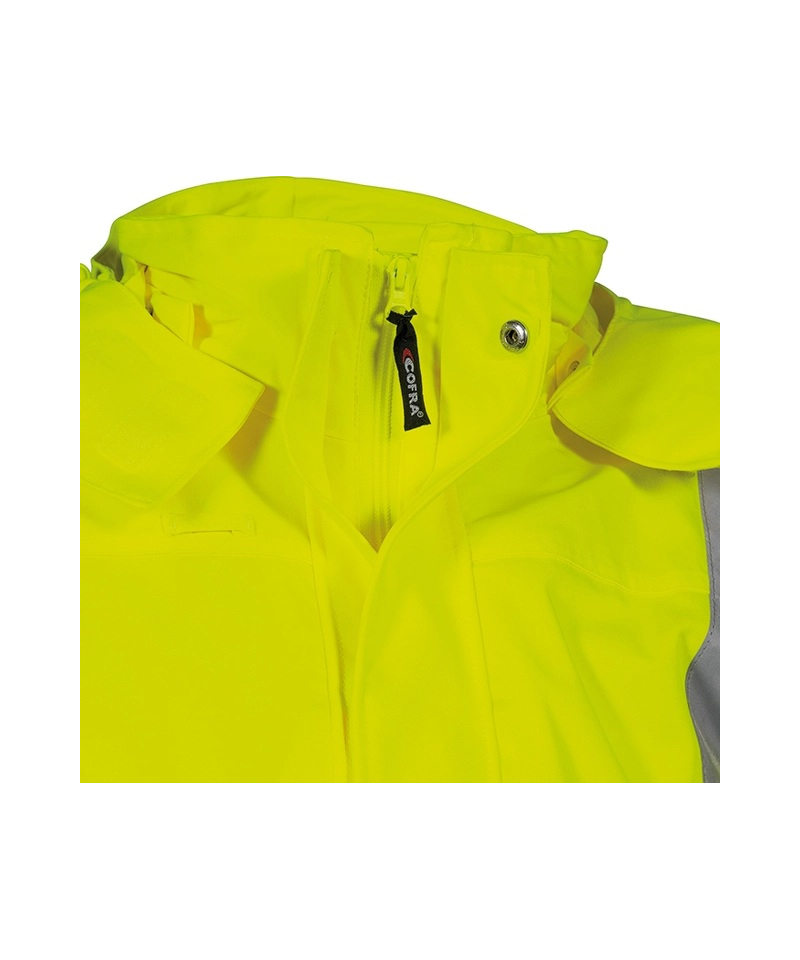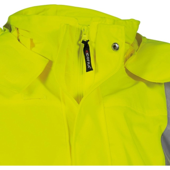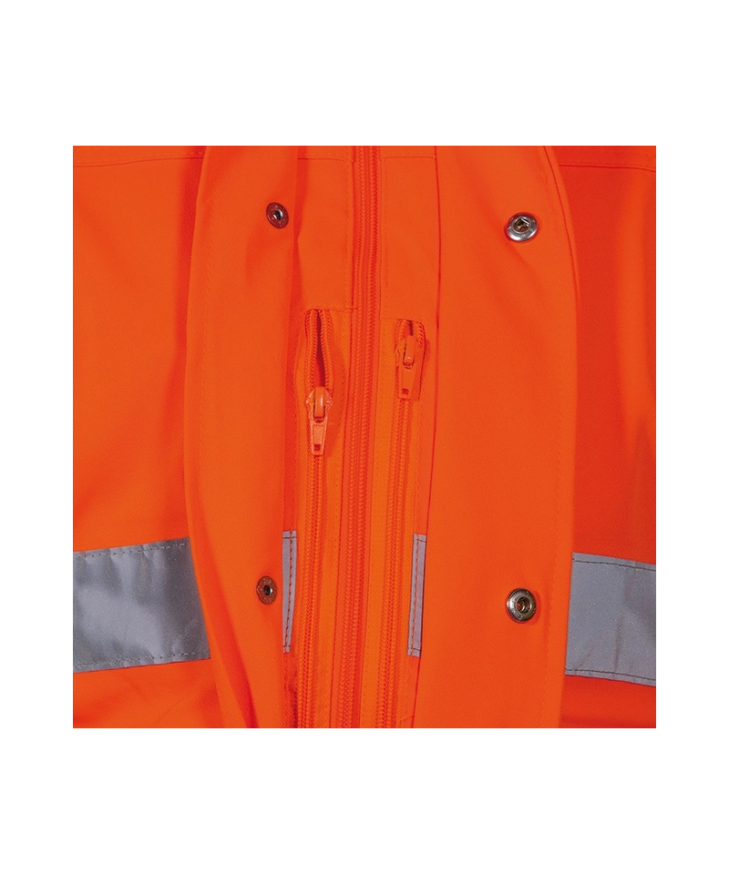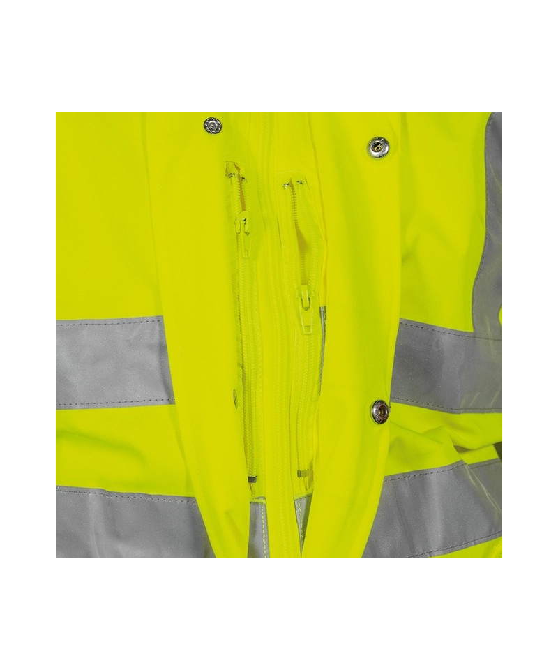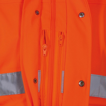 Model FLUO zaprojektowano z dbałością o detale funkcjonalne. Posiada dwie obszerne kieszenie przednie zapinane na rzep, dwie wewnętrzne kieszenie piersiowe z zamkiem błyskawicznym, praktyczną kieszeń na identyfikator oraz odpinany kaptur. Elastyczny pas i mankiety zapewniają idealne dopasowanie, a szwy zgrzewane termicznie chronią przed przenikaniem wilgoci. Odzież wyposażono również w odblaskowe paski, które gwarantują doskonałą widoczność w warunkach ograniczonego oświetlenia.