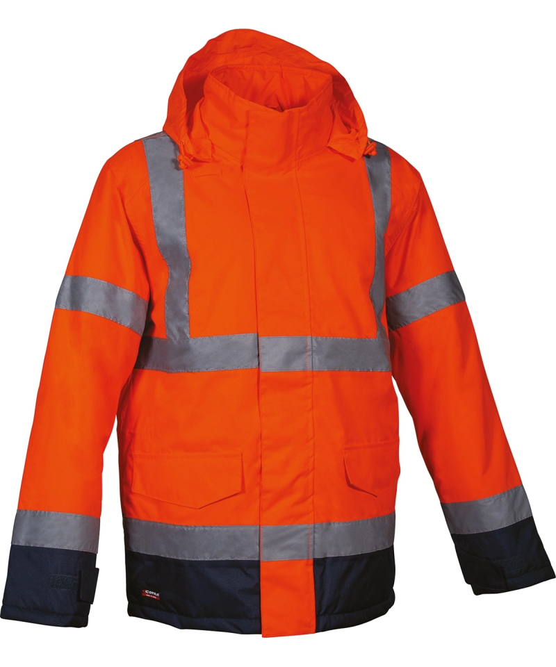 Kurtka posiada regulowany, chowany kaptur oraz mankiety na rzep, które pozwalają dopasować odzież do indywidualnych potrzeb użytkownika. Dwie pojemne kieszenie z przodu, wewnętrzna kieszeń zapinana na zamek oraz praktyczna kieszonka na identyfikator czynią ten model wyjątkowo funkcjonalnym. Odzież spełnia również wymogi dotyczące wysokiej widoczności, co czyni ją idealnym wyborem dla osób pracujących w miejscach o ograniczonym oświetleniu.