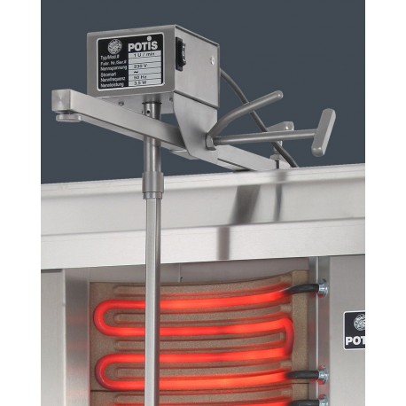 Wykonany głównie z wysokiej jakości, nierdzewnej stali szlachetnej, a także z nowoczesnych i wytrzymałych tworzyw sztucznych oraz innych, odpornych na działanie korozji metali i stopów, zasilany trójfazowym, zmiennym prądem elektrycznym, wolnostojący opiekacz pionowy do mięsa, z ceramicznym elementem grzewczym. Potis F CE3, jest idealny do przygotowywania i podgrzewania mięsa kebabowego lub mięsa na gyrosa, czy też grilla.