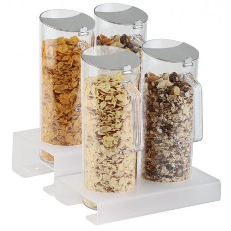 W skład zestawu wchodzą: 2 dzbanki do muesli o pojemności 1,5 l oraz akrylowa podstawa o wysokości 40 mm. Wykonane z poliwęglanu dzbanki posiadają szczelna pokrywę, która pozwala dłużej zachować świeżość produktu. Pojemnik otwierany za pomocą nierdzewnej klapki.