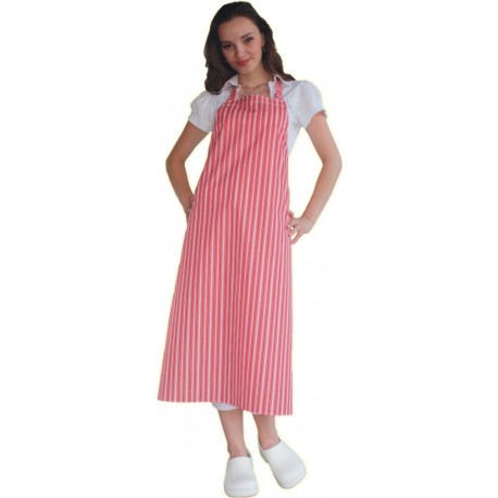 Fartuch roboczy powlekany w paski. Zastosowanie: kuchnie, stanowiska obsługi klienta, służby utrzymania czystości itp. Dostępny w kolorze czerwonym w białe paski i niebieski w białe paski.